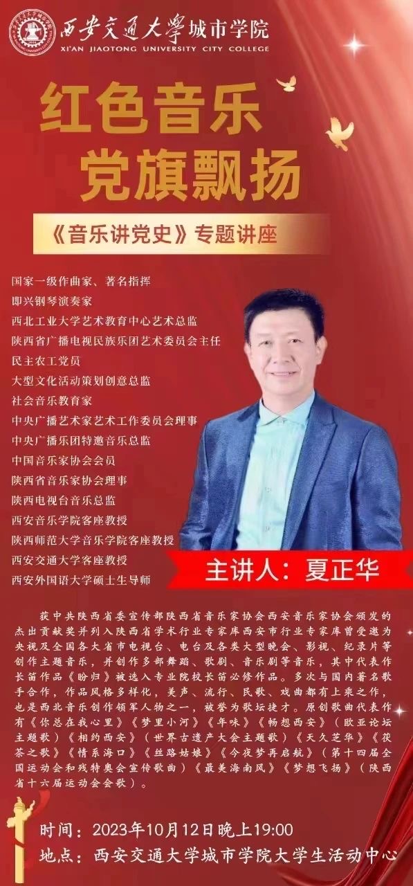 10月12日晚,学院团委邀请国家一级作曲家、著名指挥、中央广播艺术家艺术工作委员会理事夏正华教授开展“音乐讲党史”专题讲座。