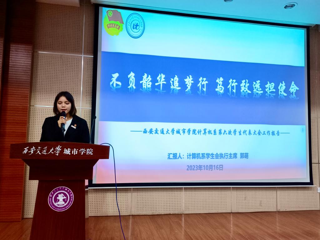 随后计算机系学生会执行主席郭萌作题为《不负韶华追梦行,笃行致远担使命》的大会工作报告。报告全面总结了计算机系上一年学生会工作的主要成绩与工作经验,并提出了新阶段计算机系学生会工作的新蓝图。