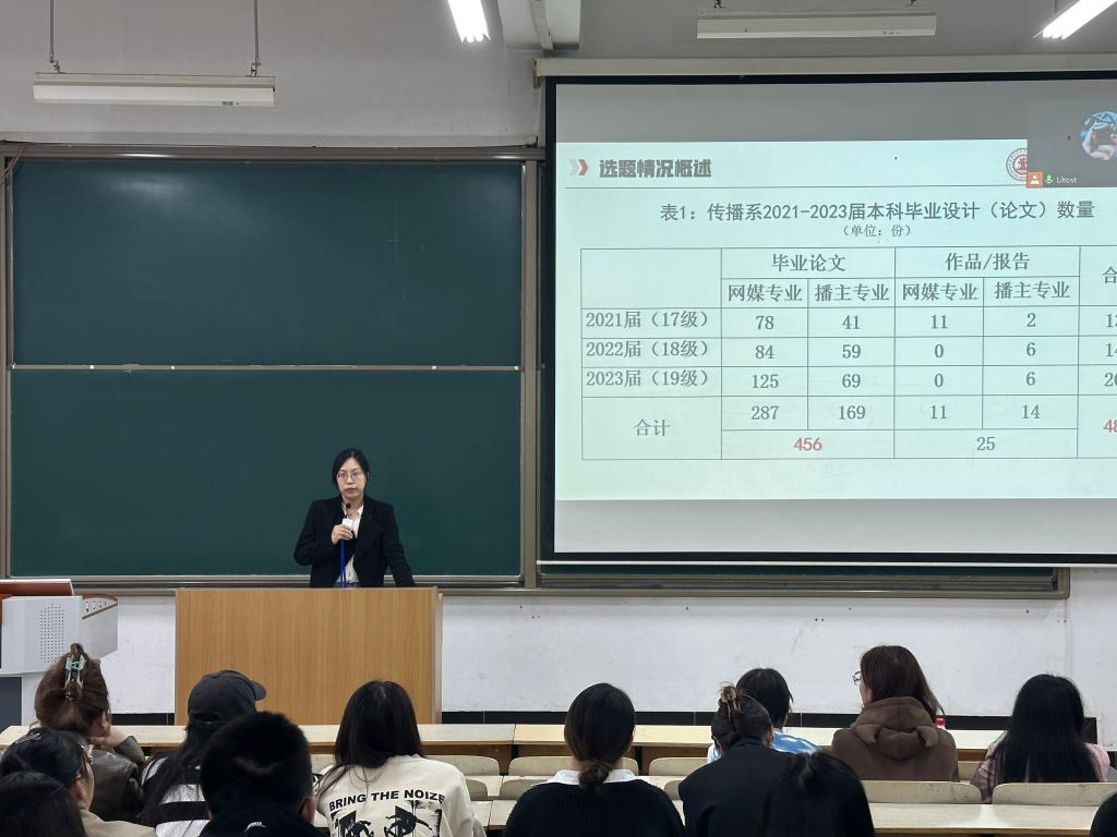 网媒专业教师郭晨雪进行论文选题要求讲解。郭老师对传播系2021届至2023届毕业论文的选题进行汇总与分析,以图表形式清晰展现近三年传播系毕业论文选题情况,解读往届学生的选题类型和选题依据,提醒学生避免出现选题不当的现象。郭老师讲解例证清晰,深入透彻,为2024届毕业生选题拓宽思路。