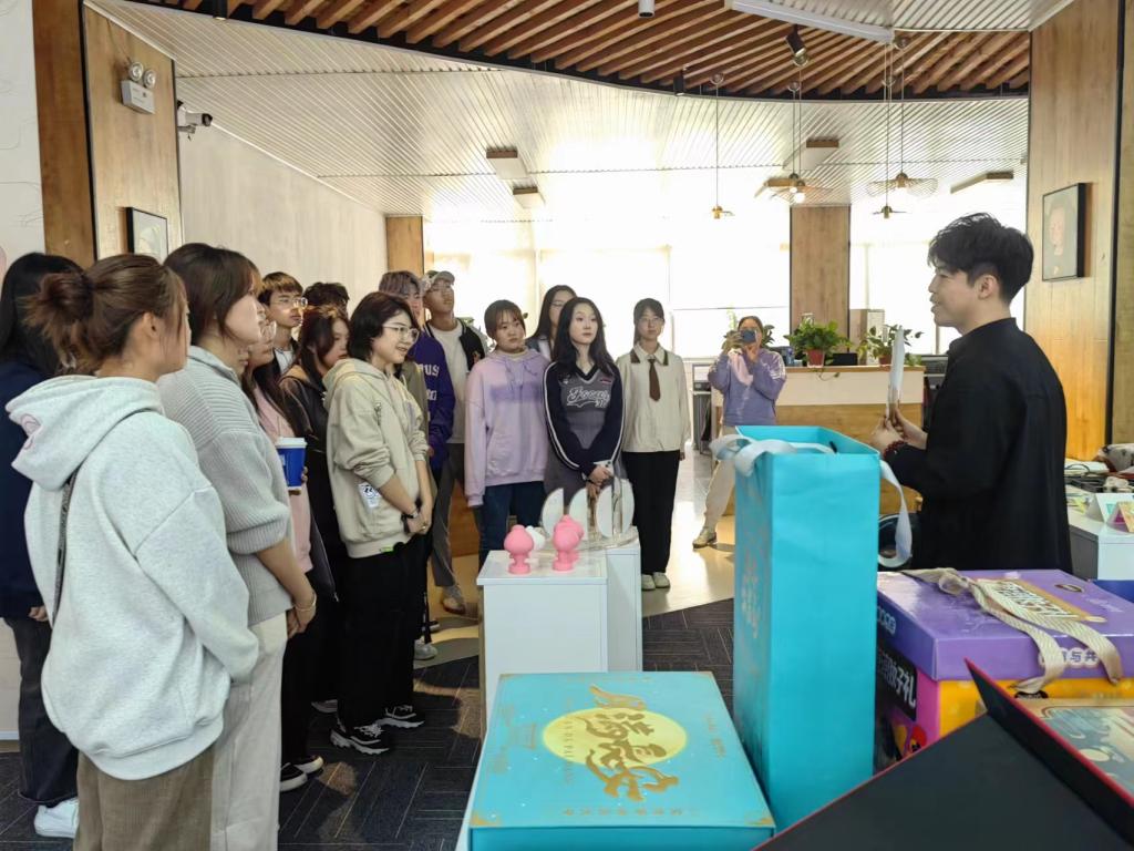 企业课堂现场,来自西安桥合动漫科技有限公司的首席执行官、资深设计师乔先生为学生们详细介绍了动漫在文创中的应用情况以及文创的基本流程、创意构思、技术运用等方面的知识。企业现场展示了丰富的具有陕西文化特色的文创产品,设计师以原创的IP唐妞为例分享了个人的设计经验,在与学生的分享中强调了文化自信和文化认同感,希望通过唐妞的形象让更多人了解和喜爱中国的历史文化,也希望学生在进行设计实践中多思考现代设计与传统文化之间的融合关联。