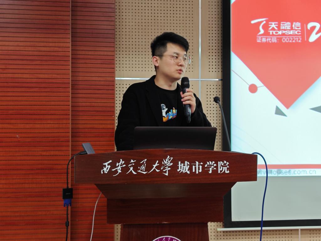 为增强大学生网络安全意识、更好地了解网络安全专业,yl7703永利官网计算机学院邀请北京天融信教育科技有限公司于11月30日在F100举办题为“现代信息技术大讲堂-信息安全与技术分享”讲座。北京天融信教育科技有限公司西安分公司李瑞港经理,计算机学院实验室主任胡朋,辅导员康乃馨、刘浩楠参与此次讲座。此次讲座由计算机学院学工负责人崔佳楠主持。