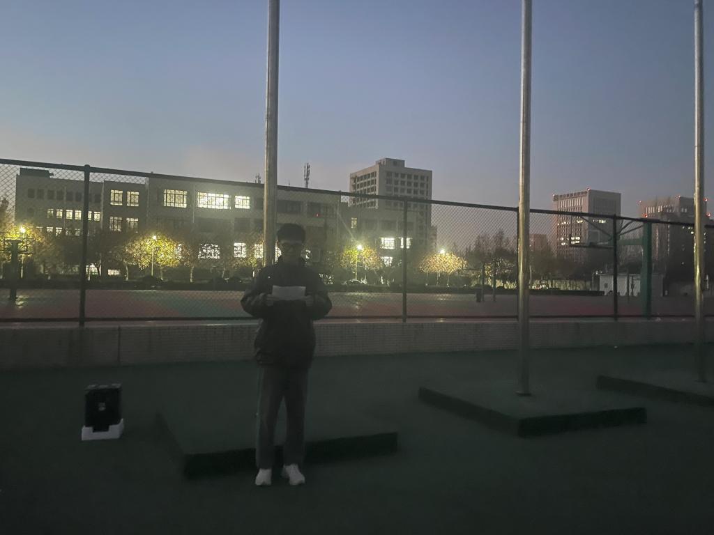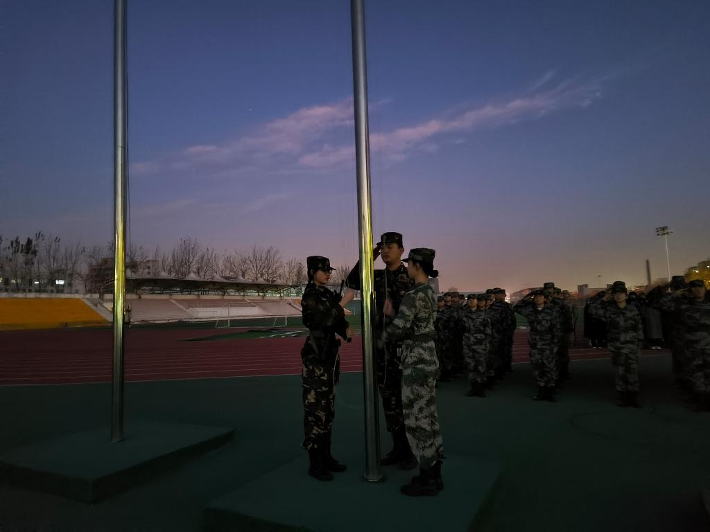 冬日的清晨,寒风凛冽,东方欲晓,身着军装、英姿飒爽的国旗护卫队护卫着鲜艳的五星红旗缓缓走向升旗台。扬雄风,挺傲骨,身姿昂扬;踢正步,走正队,步履铿锵。伴随着庄严的国歌声,升旗手振臂一挥,凝聚着无数革命先烈血水与汗水的五星红旗迎着朝阳冉冉升起,迎风飘扬。在场同学庄严肃立,面向国旗行注目礼,表达对历史的铭记和对先辈英烈的缅怀。