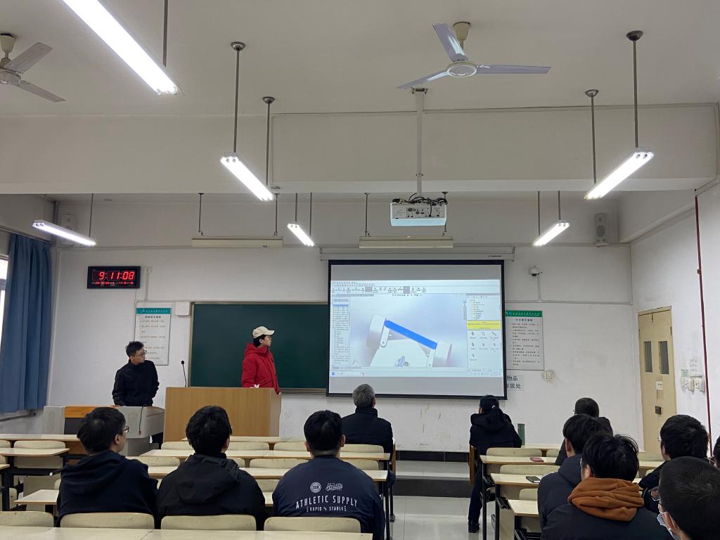 随后,各参赛队学生通过PPT讲解及视频演示等方式,提出设计思路,详细阐述了参赛作品的功能、结构和原理等方面的内容,依次汇报了作品建模、优化设计、图纸绘制、动画和实物制作等方面的进度。所有参会教师针对参赛作品都提出了自己的意见和建议。