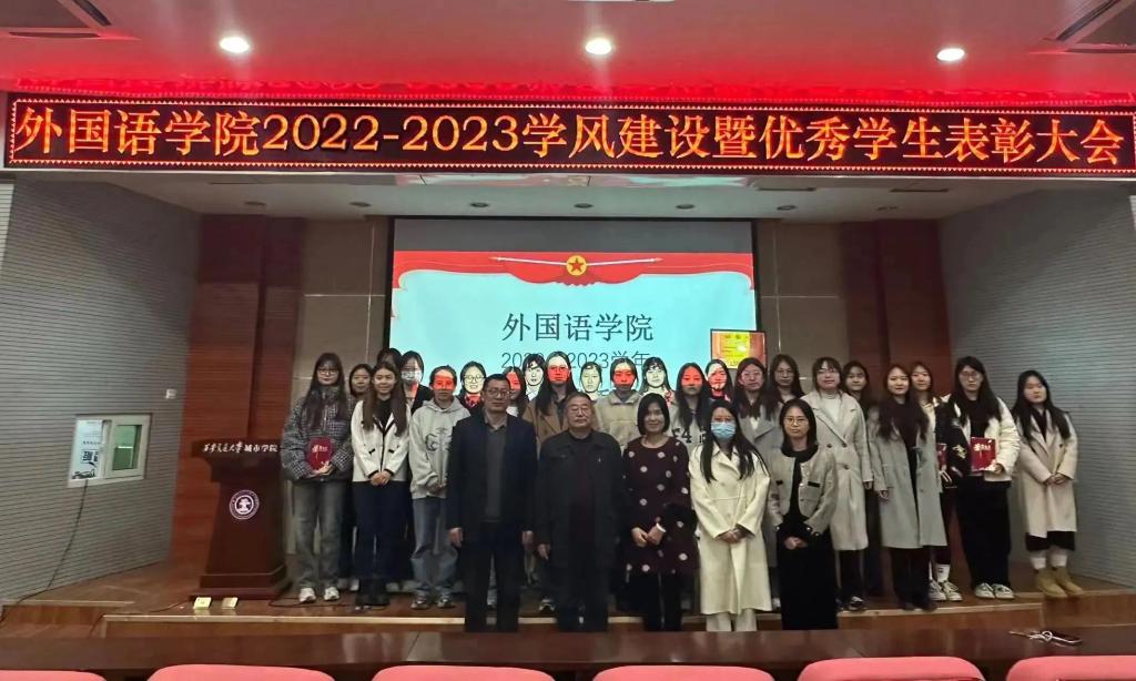 逐梦新时代,青春绽芳华。为展现青年风采,激励广大学生奋发进取,争先创优,3月13日中午,外国语学院在F100教室召开2022-2023学年学风建设暨优秀学生表彰大会。外国语学院吴夫迎院长助理,张慧副教授,杜彦龙副译审,学生工作负责人吴丹,团工委书记韩蓉及各先进集体和先进个人代表出席本次大会。