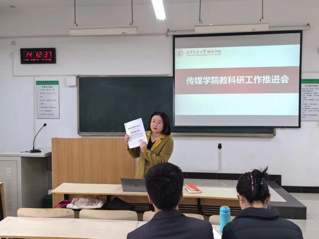 为进一步推进传媒学院教科研工作,提高教师教科研工作水平,3月26日下午,传媒学院于教C408召开教科研工作推进会议。副院长吴越,院长助理、新媒体系副主任马岚,播音系副主任高宇以及全体教师、教学秘书参加会议。会议由吴越副院长主持。