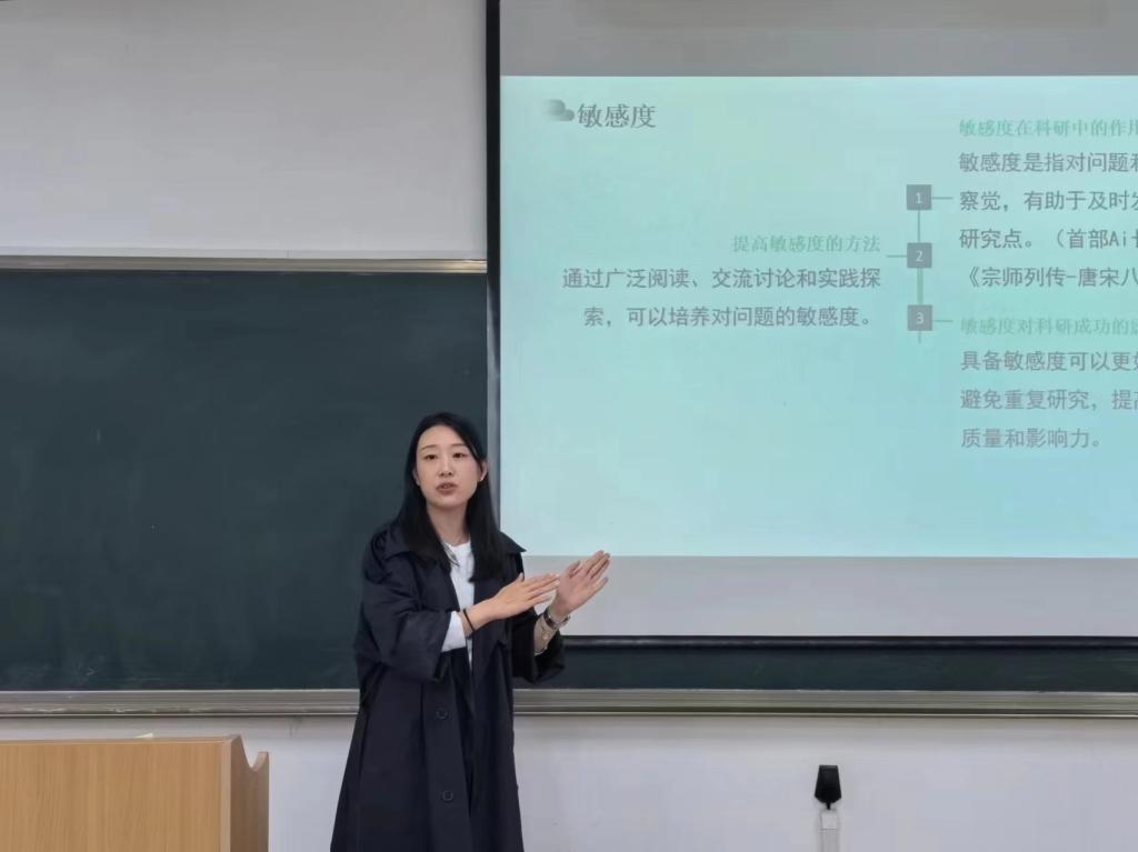 播音专业教师孙菡忆进行科研心得分享。她结合自身学习、科研经验,分享了切实有效的科研方法和心得体会。她提出,科研工作要遵循紧迫感、主动性、持续性、反复性等原则,以此激发和维持教师的科研热情与自我驱动力。