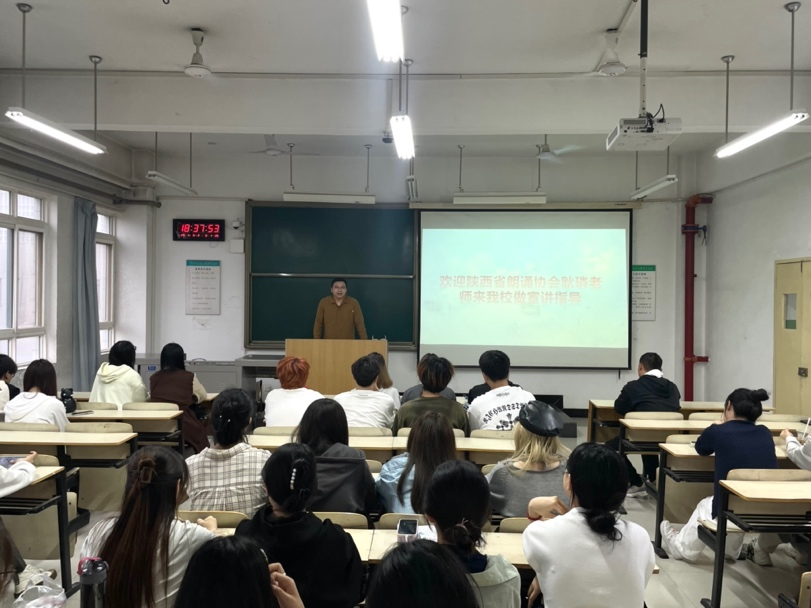 为提高传媒学院播音与主持艺术专业学生的基本功和朗诵表达技巧,4月9日晚,传媒学院在教学楼D503举办第六届丝路朗诵大赛赛前指导专题讲座。本次讲座邀请陕西省朗诵协会秘书长,丝路朗诵大赛组委会秘书长耿璘讲解朗诵技巧与参赛注意事项。传媒学院院长助理刘敏涛、播音系副主任高宇、教师郭智恒,播音专业2022级、2023级全体学生参加了本次讲座。