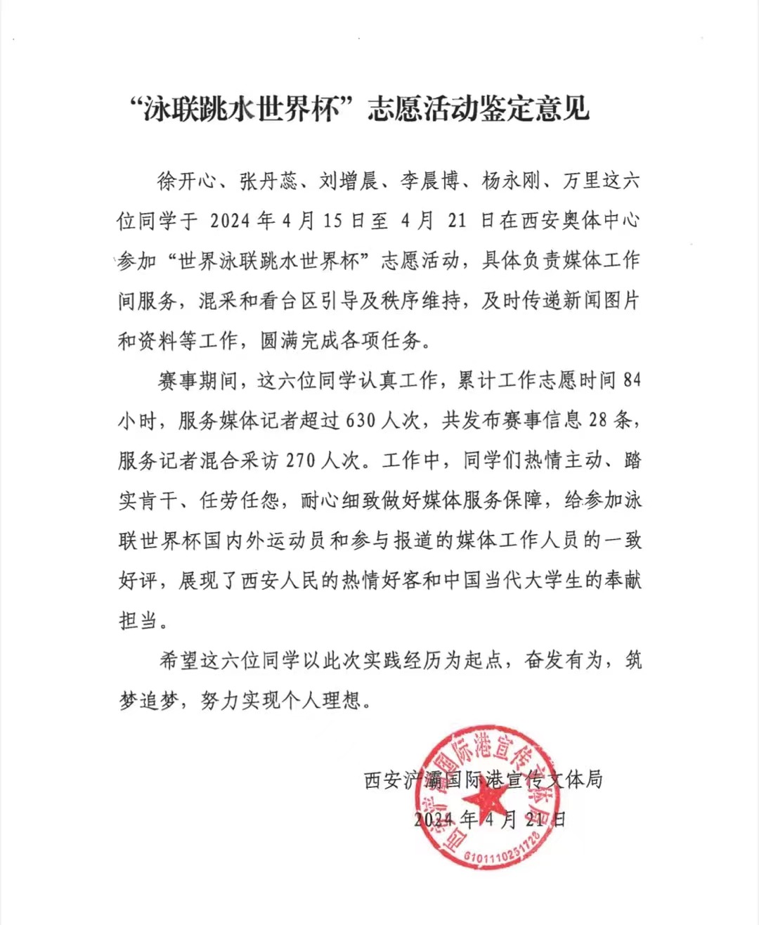 4月21日,“2024世界泳联跳水世界杯总决赛”在西安落下帷幕。我校60名青年志愿者在为期7天的志愿服务工作中,以饱满的热情和专业的态度完成了竞赛保障、接待保障、媒体宣传、体育展示、观众服务等多项工作,得到了参赛运动员、嘉宾、大会组委会及团市委领导的高度肯定。