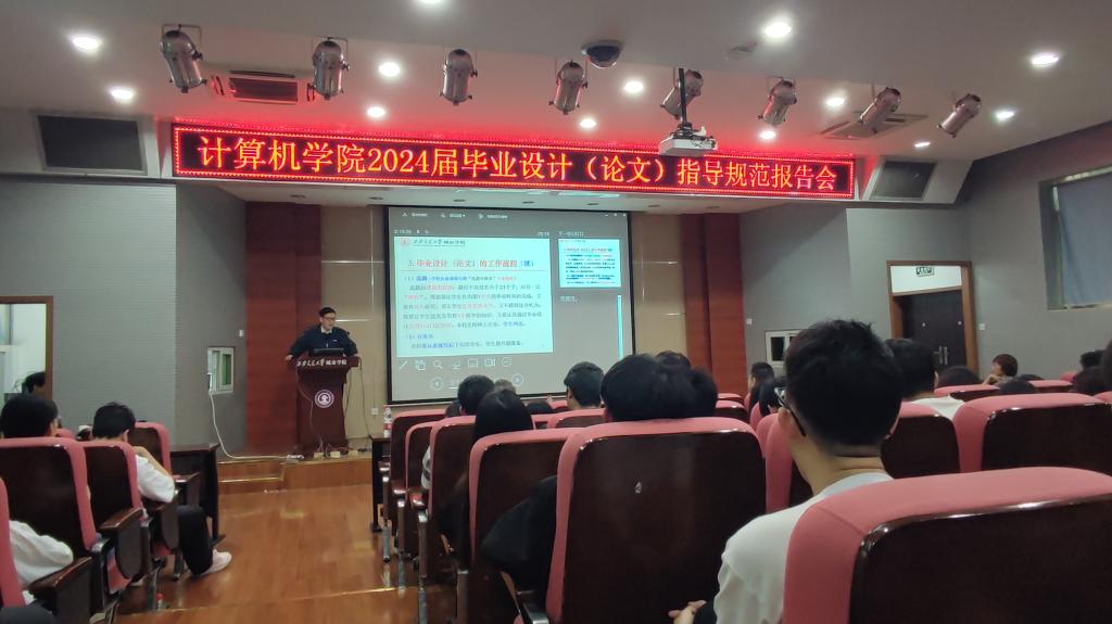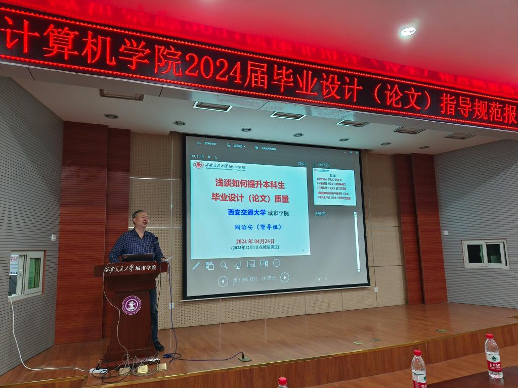 为了进一步加强毕业设计(论文)格式规范性,提高计算机学院2024届学生毕业设计(论文)质量,4月24日,计算机学院邀请校督导组专家阎治安教授开展了题为“浅谈如何提升本科生毕业设计(论文)质量”专题报告会,此次报告会通过线上直播+线下会议结合的方式进行。全体2024届毕业设计指导教师、毕业生辅导员及2024届毕业设计学生参会,会议由计算机学院院长姚全珠主持。