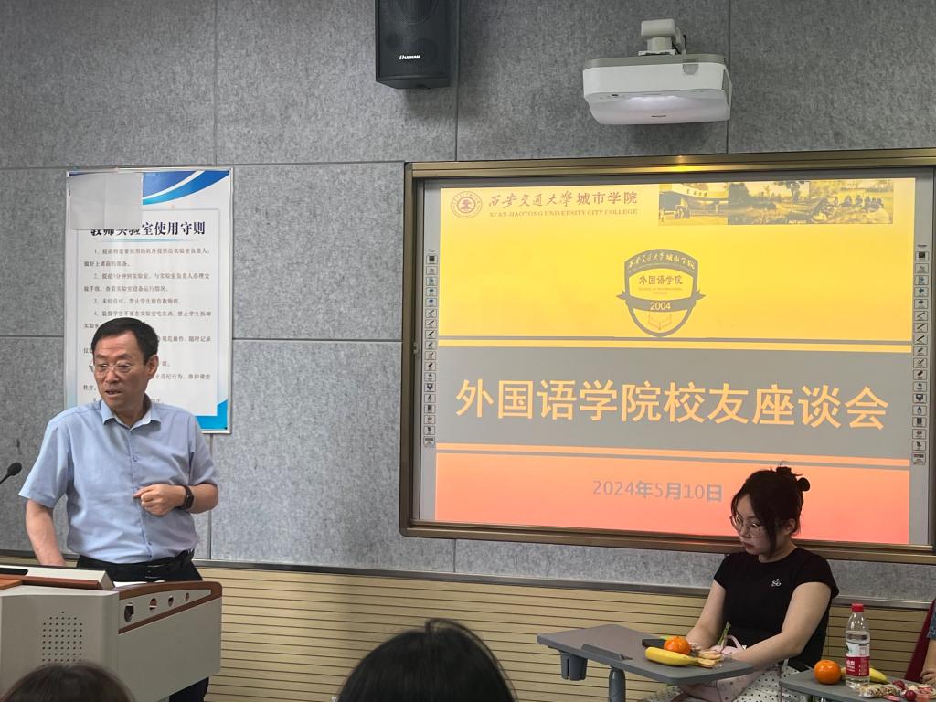 郭继荣院长总结讲话。他对各位校友的到来表示热烈的欢迎和衷心的感谢,他指出,校友是学校建设发展可依靠的力量和宝贵的资源。近年来学院高度重视校友工作,关心和重视校友的成长和发展,外国语学院将一如既往地为校友提供支持,共创互惠共赢的发展新格局。同时,他希望校友们能够继续关注和支持学院的发展,在校企合作、人才培养和毕业生就业等方面给予更多地关心和支持。最后,他对在校生提出殷切期望,勉励他们博览群书,厚积薄发,做有梦想、够自律、有动力的人,以优秀校友为榜样,立足岗位,用自己的青春、奋斗和成就,为社会做出了更大的贡献。