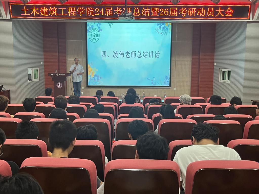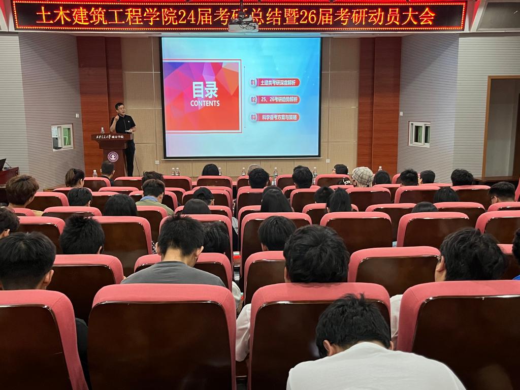 为充分调动学生的考研积极性,帮助学生了解考研形势,明确考研目标,增强考研信心。土木建筑工程学院于5月13日在F100开展了“‘研’途有你,踔厉同行”24届考研总结暨26届考研动员大会。土木建筑工程学院院长廖红建、副院长黎莹,专业教学督导专家凌伟、教工党支部书记郭秀芹、学生工作负责人李辉及各位班主任、辅导员、2026届有意向备考研究生考试的同学参加了本次讲座。本次大会由何佳兴同学主持。