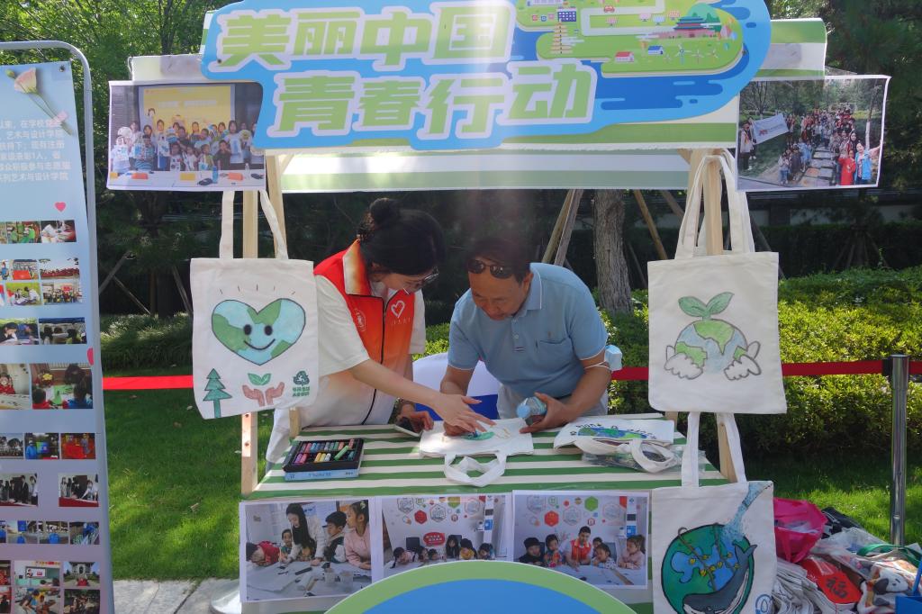 活动中,我校志愿者将专业特色与环境保护相结合,用水彩在环保手提袋上绘画出“青枝绿叶”,用实际行动呼吁广大市民爱护环境要从身边做起。参与者们根据自己奇特的想象力,在志愿队队员的引导下,在白色的帆布袋上留下了属于自己五彩斑斓的环保记忆。同时,在授旗环节中,我校也是本次活动上台接旗的“美丽中国 青春行动”10支生态环保青年志愿服务队代表之一。
