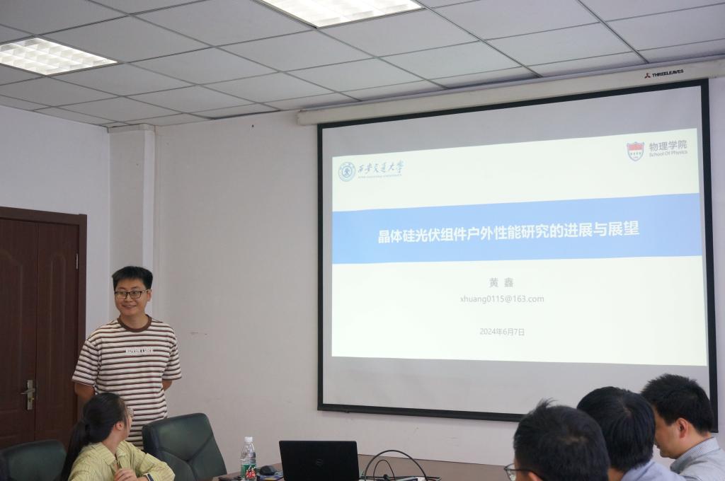 会议伊始,黄丽清处长对两位博士表示了欢迎。随后,黄鑫博士作题为“晶体硅光伏组件户外性能研究的进展与展望”的报告,他从光伏行业的发展现状开始,从实验的角度介绍了目前国内外对于光伏组件的研究状况和基本研究思路,包括晶体硅光伏组件性能的评价指标、户外条件与标准条件的性能差异以及导致差异出现的多种原因,并对当前的研究热点进行分析。报告具有很强的专业性,精彩阐释了晶体硅光伏组件户外性能研究的最新进展。王蔓博士作题为“多晶CdTe的晶界钝化”的报告,从碲化镉(CdTe)薄膜光伏技术开始,介绍了目前碲化镉(CdTe)薄膜需要解决的问题,从模拟计算的角度对掺杂碲化镉(CdTe)薄膜晶界钝化的研究状况和研究过程做了精彩阐述。