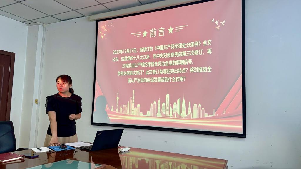 支部书记黄迎带领大家解读并学习了《中国共产党纪律处分条例》(以下简称《条例》)。黄迎书记对《条例》的解读主要着眼于条例为何再次修订、此次修订的突出特点以及对推动全面从严治党向纵深发展起到的作用三个方面,为全体支部党员学习领会《条例》提出了思路和要求。