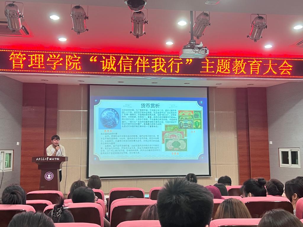 活动伊始,郭俊杰同学进行“文物有声,薪火相传”历史科普志愿宣讲,他从古代货币的历史变迁为切入点,讲述货币的历史发展并列举各个朝代伪造货币及朝廷不诚信导致经济崩盘的案例,强调诚信在货币流通中具有重要的地位和作用,只有建立了健全的诚信体系,才能保障货币流通的顺畅和稳定。随后,同学们观看了几段与诚信有关的视频,引发了同学们深深地思考。刘连宏从诚信育人和诚信资助两个方面进行会议总结,她提出大家要有诚信意识,从我做起,从小做起,都养成诚信的习惯,推己及人,传递诚信。从养成良好的行为规范开始,说实话做实事,在四六级和期末考试中用诚实和实力为自己交上一份满意的答卷。