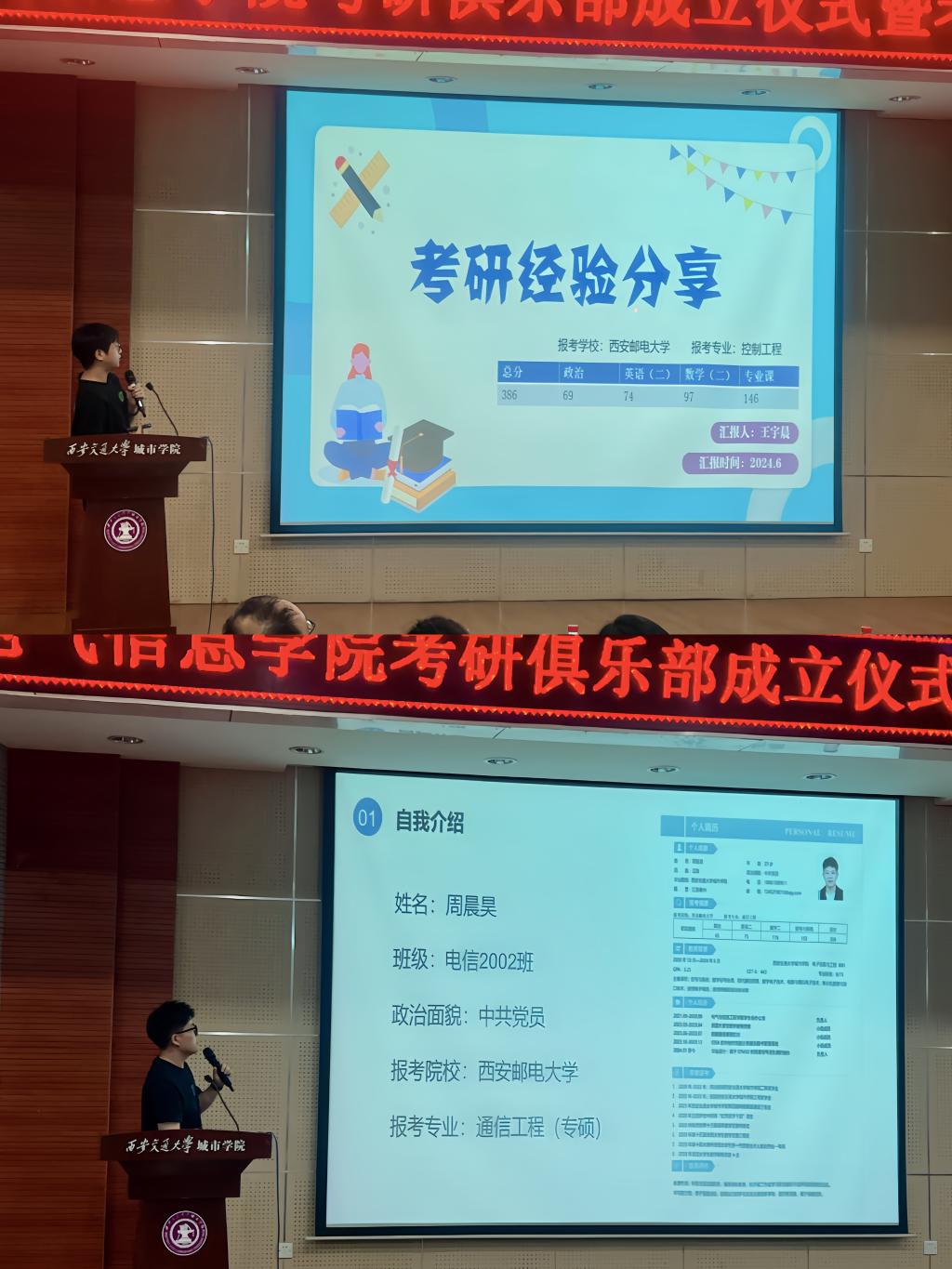 2024届考研成功上岸的周晨昊、王宇晨同学进行经验分享。两位同学结合自身的考研经历,从备考规划、学习方法、心态调整等多个方面进行了详细而深入地分享。结合考研俱乐部的安排,会上聘任王宇晨、党玥淇、张显、周晨昊、黄思绒为电气信息学院学业导师,为低年级同学传授经验、解答问题,并由刘晓明、梁新雨两位老师向他们颁发聘任证书。
