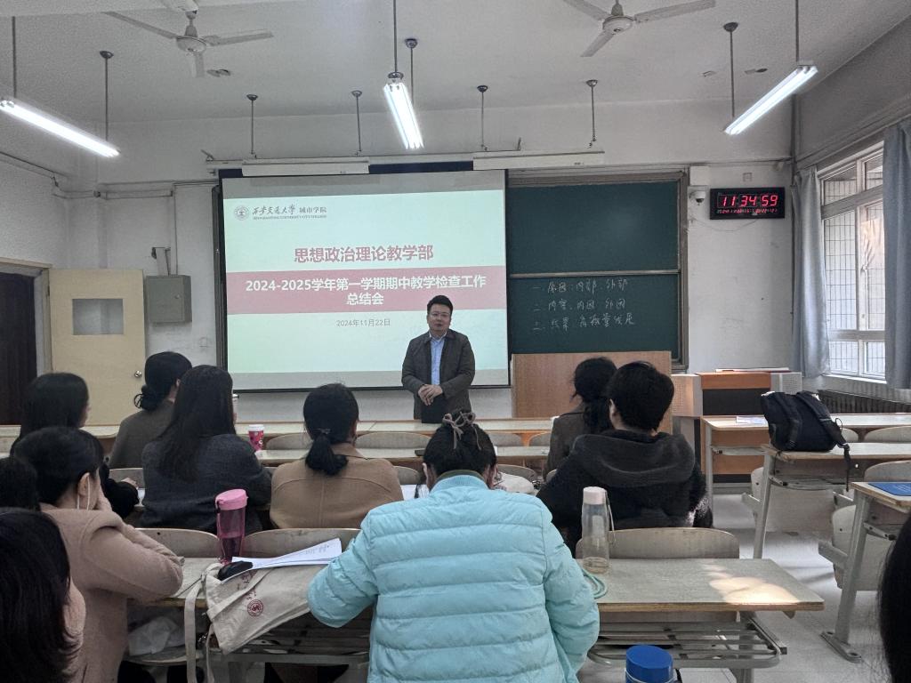11月22日,思想政治理论教学部在教一D109教室举行了期中教学检查总结会。思政部副主任曹嘉伟副教授及全体教师参加会议,会议由思政部主任助理、日常教学工作负责人常媛副教授主持。