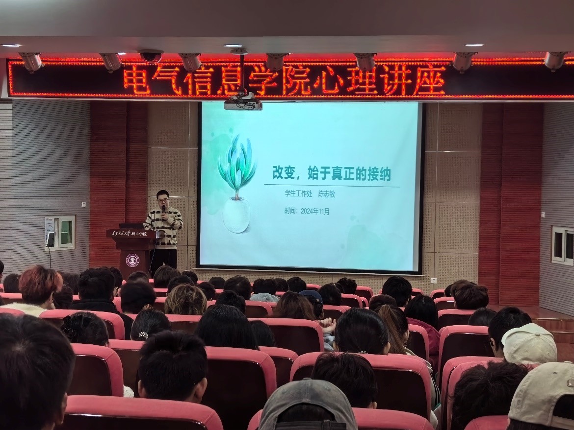 为普及心理健康知识,提升学生心理健康素养,11月7日中午,电气信息学院在F100报告厅举办新生心理健康知识讲座——改变,始于真正的接纳。特邀学校心理中心陈志敏主讲。电信学院2024级、2023级各专业班级心理委员、宿舍心理委员共同参加。