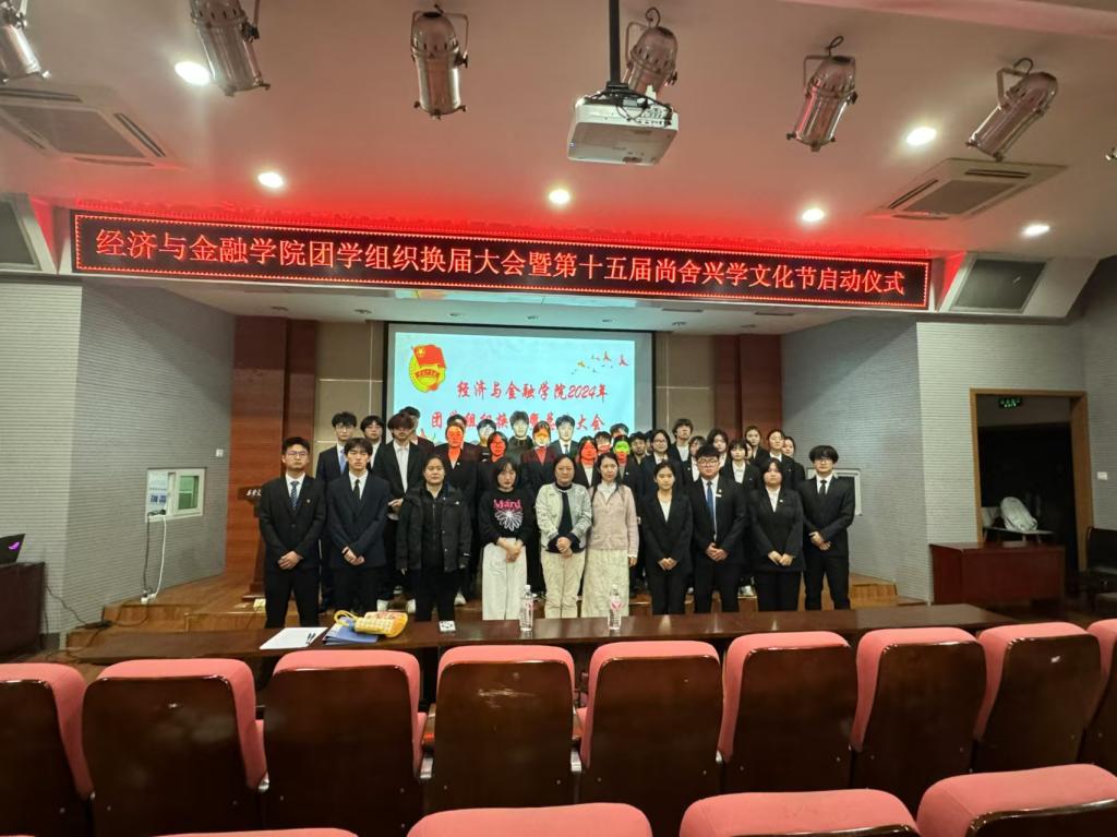 经济与金融学院于10月30日在F100举行经济与金融学院第十五届团学组织换届大会与第十五届“尚舍兴学”文化节启动仪式。经济与金融学院院长助理廉宇婷、团工委书记蒋美一帆、学工办杨静怡、张进参加活动。本次大会由支部学生团员王蒙恩主持。