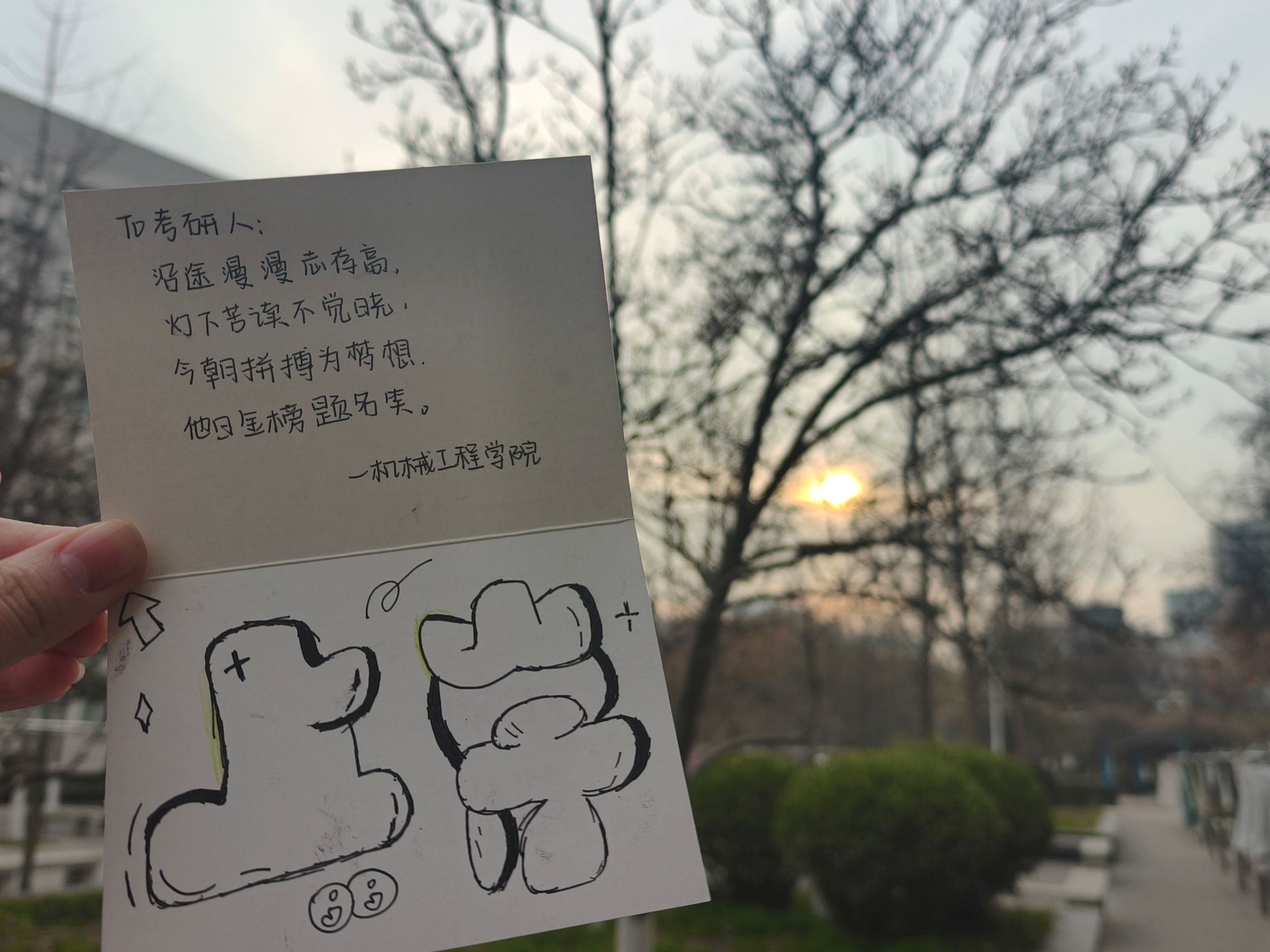 随着2025年全国硕士研究生招生考试日益临近,万千学子进入了紧张的备考阶段。12月18日,机械工程学院学生会志愿者为考研学子送上了一份寓意深远的礼物——考研明信片,为他们加油鼓劲,传递学校关爱。