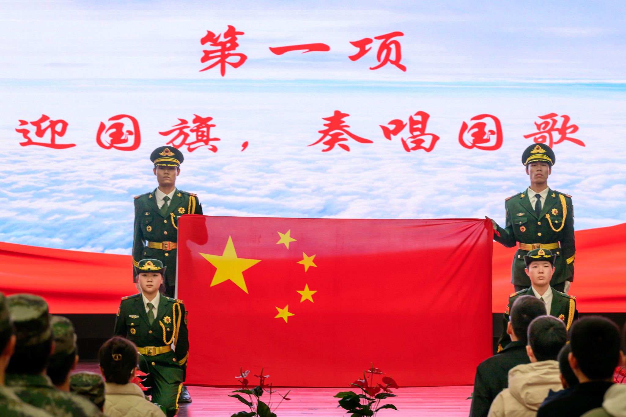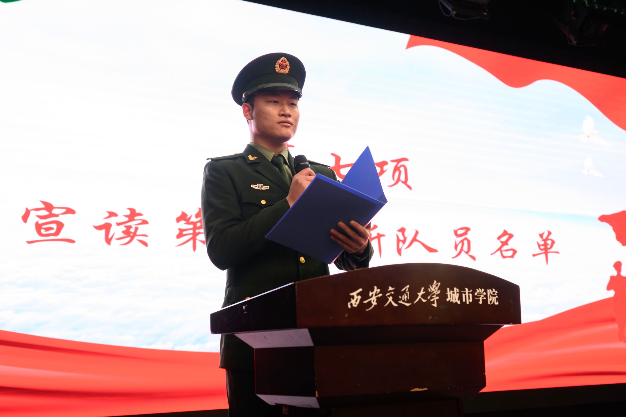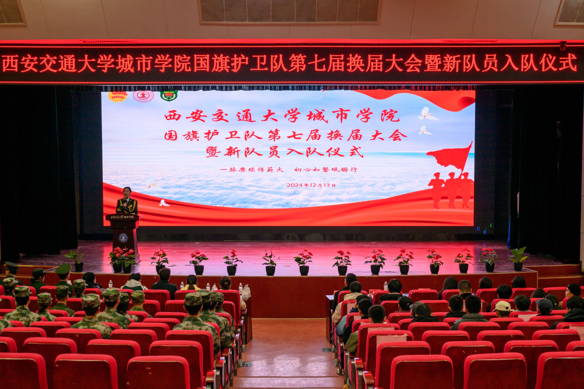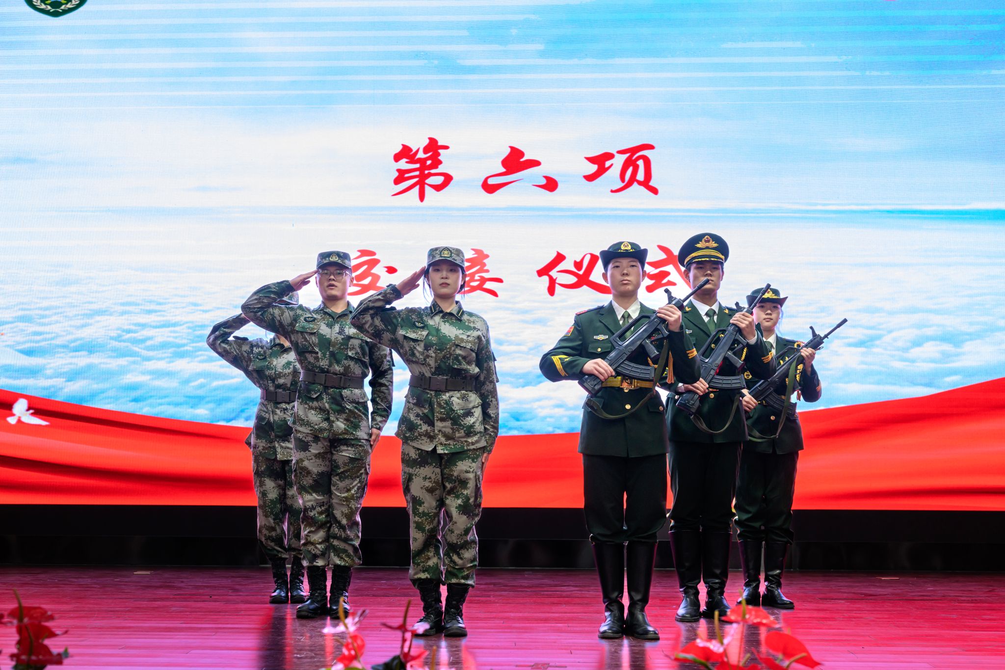 国旗护卫队队长雷智斌宣读24级新队员名单并为新队员授衔。校团委老师高荣宣读表彰决定并为优秀队员、优秀骨干颁发了荣誉证书。优秀队员徐峻森同学代表发言。接着,第八届队长雷智斌汇报了工作计划,他满心热切地展望国护的未来。在庄严的新队员宣誓中,大会进入尾声。
