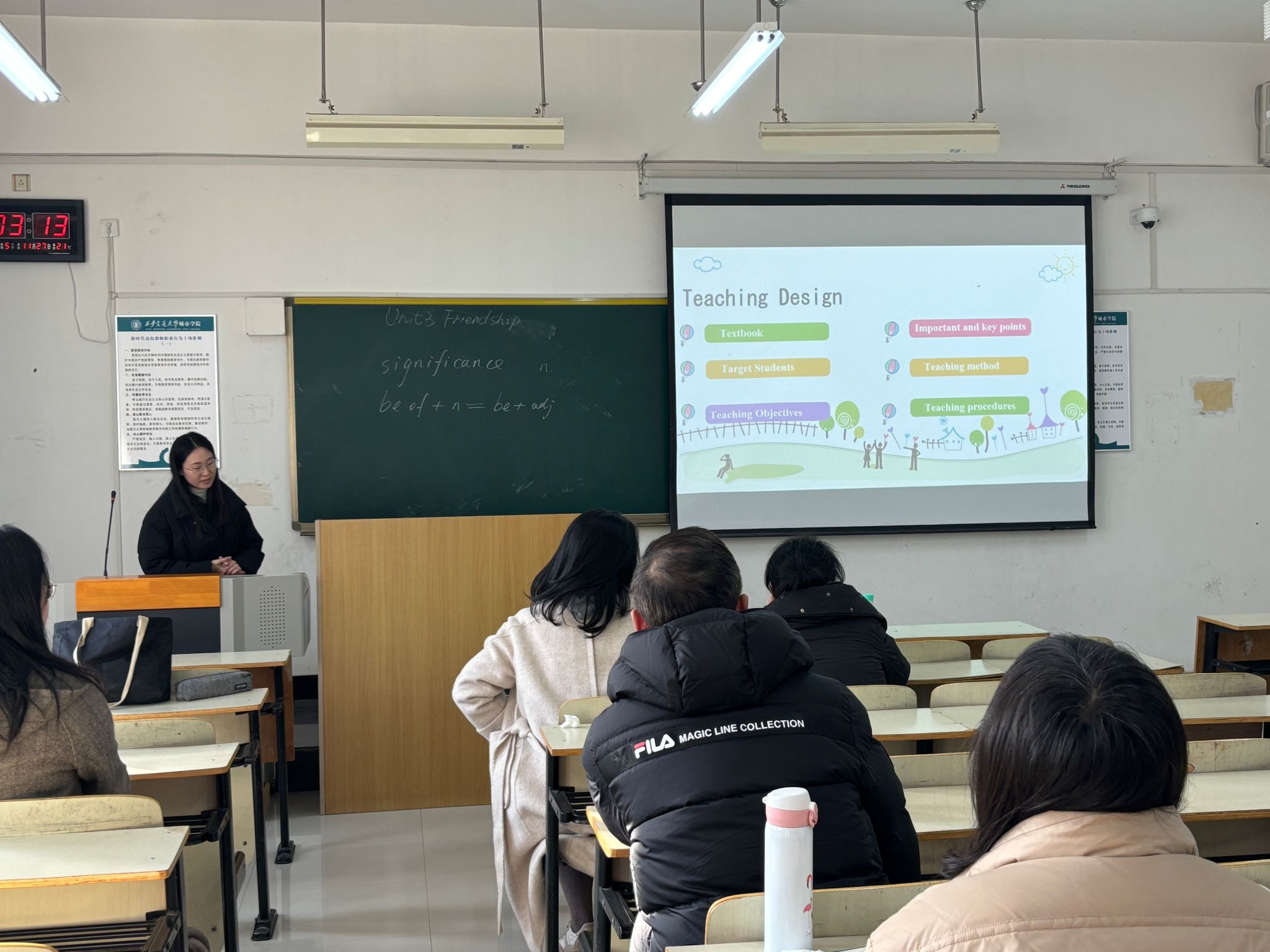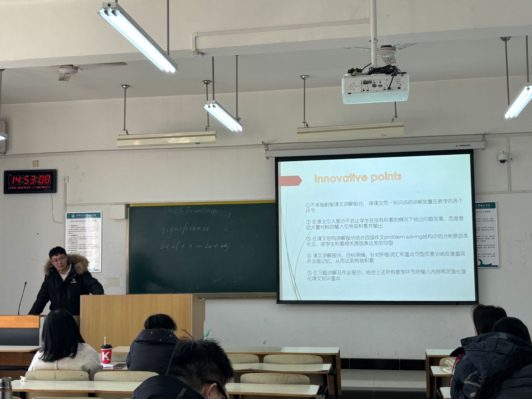 活动伊始,巫奕君副院长强调了新时代大学英语教学面临的机遇与挑战,点明本次备课成果展示旨在精准把握教学方向,优化课程内容。随后,王晶团队从中国传统文化切入,就“桃园三结义”引入话题“Friendship”,结合单元课文内容讨论“Why Do Friendships End”,将课程思政元素贯穿始终,在讲解文章结构时融入“Problem-Solving”四级写作模式,依据学生的课堂反馈、作业完成情况及考试成绩分析,指出学生在英语口语表达、跨文化交际理解等方面存在的薄弱环节,为后续备课重点提供了现实依据。