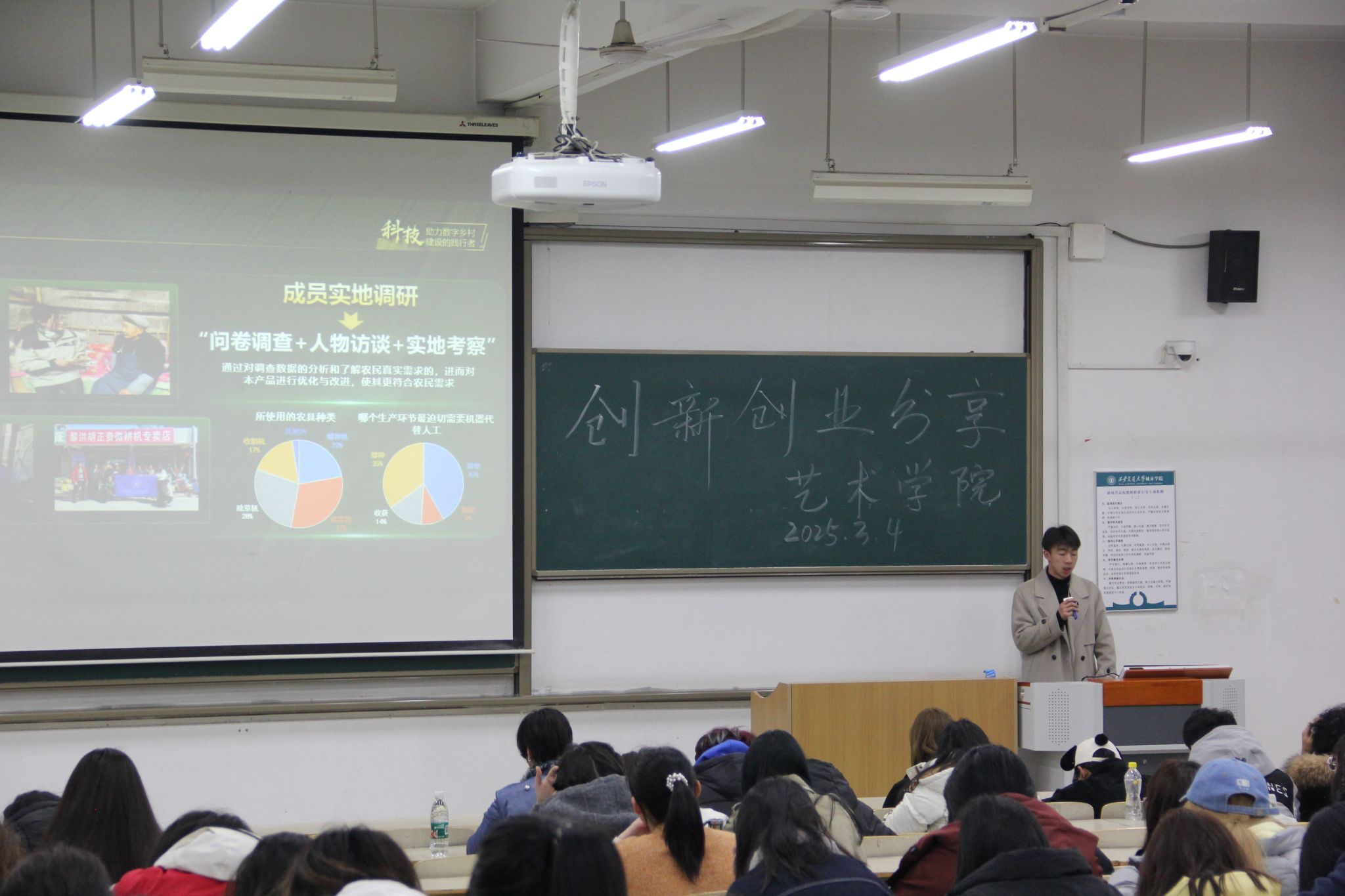随后,由艺术学院第十二届大学生挑战杯大赛陕西省银奖获得者黄月鹏、陕西省铜奖获得者张国辉两名同学向低年级学生分享参赛经验。他们从不同的视角给大家分享了他们的参赛心得,介绍了如何将艺术类学科背景融入项目中,同时分享了如何撰写计划书,筹划项目,组建团队等。
