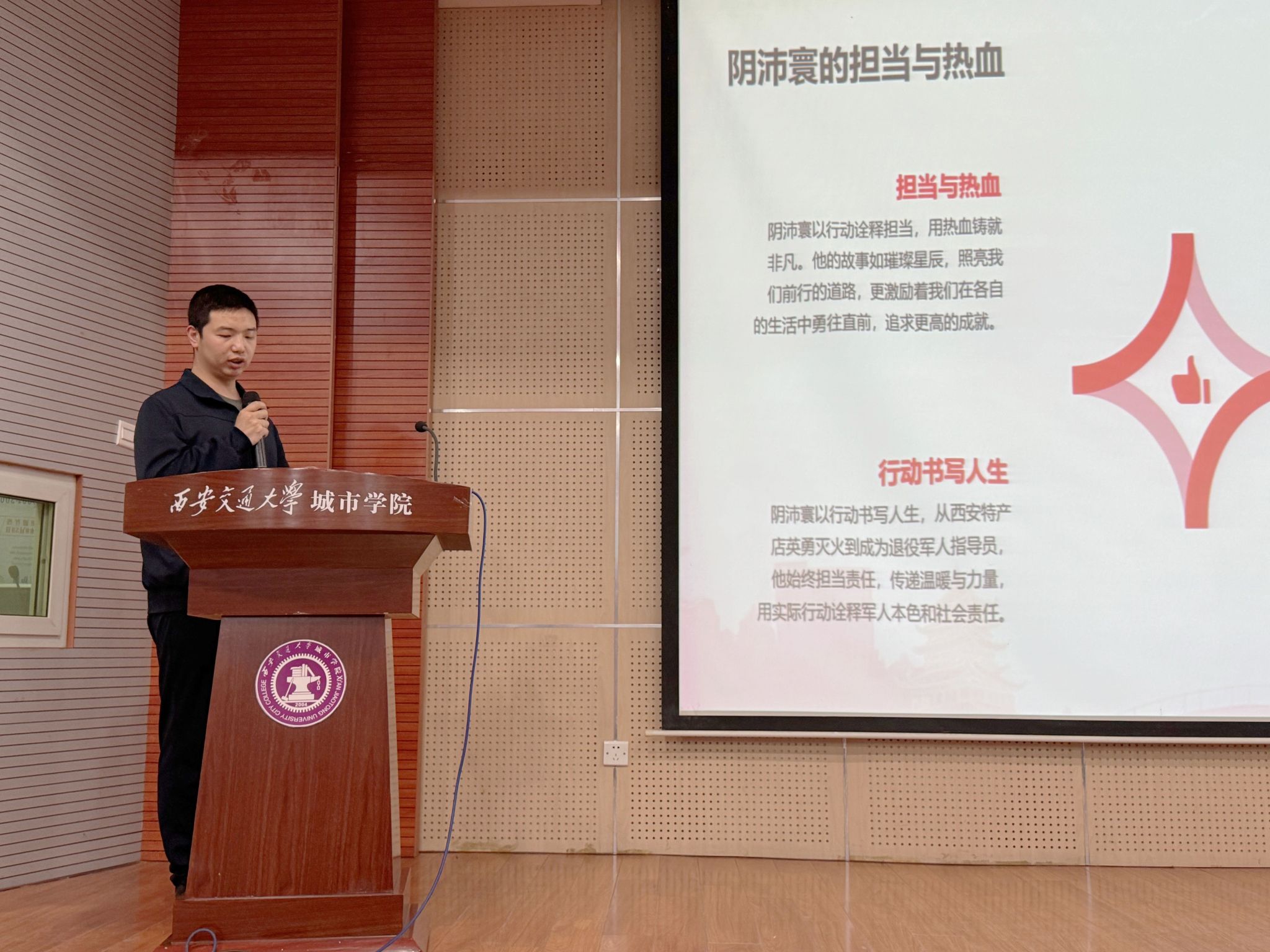 退役不褪色,见义勇为展担当。阴沛寰同学作为一名退役大学生,分享了他的青春奋斗历程。退役后,他积极投身社会服务,受聘于西安市碑林区退役军人事务局,担任退役军人政治工作指导员,成为退役军人信赖的“引路人”。