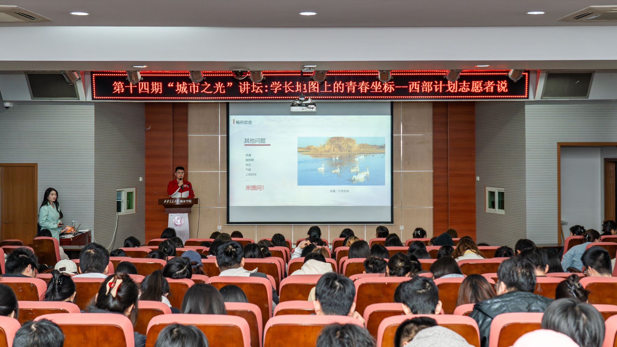 为积极响应团中央“到西部去,到基层去,到祖国和人民最需要的地方去”的号召,3月17日中午,团委在F100报告厅成功举办第十四期“城市之光”讲坛。本期以“学长地图上的青春坐标——西部计划志愿者说”为主题,特邀2024届西部计划优秀志愿者、新疆阿克苏地区库车市墩阔坦镇人民政府工作者王济州返校与200余名同学分享属于城院志愿者的青春故事。