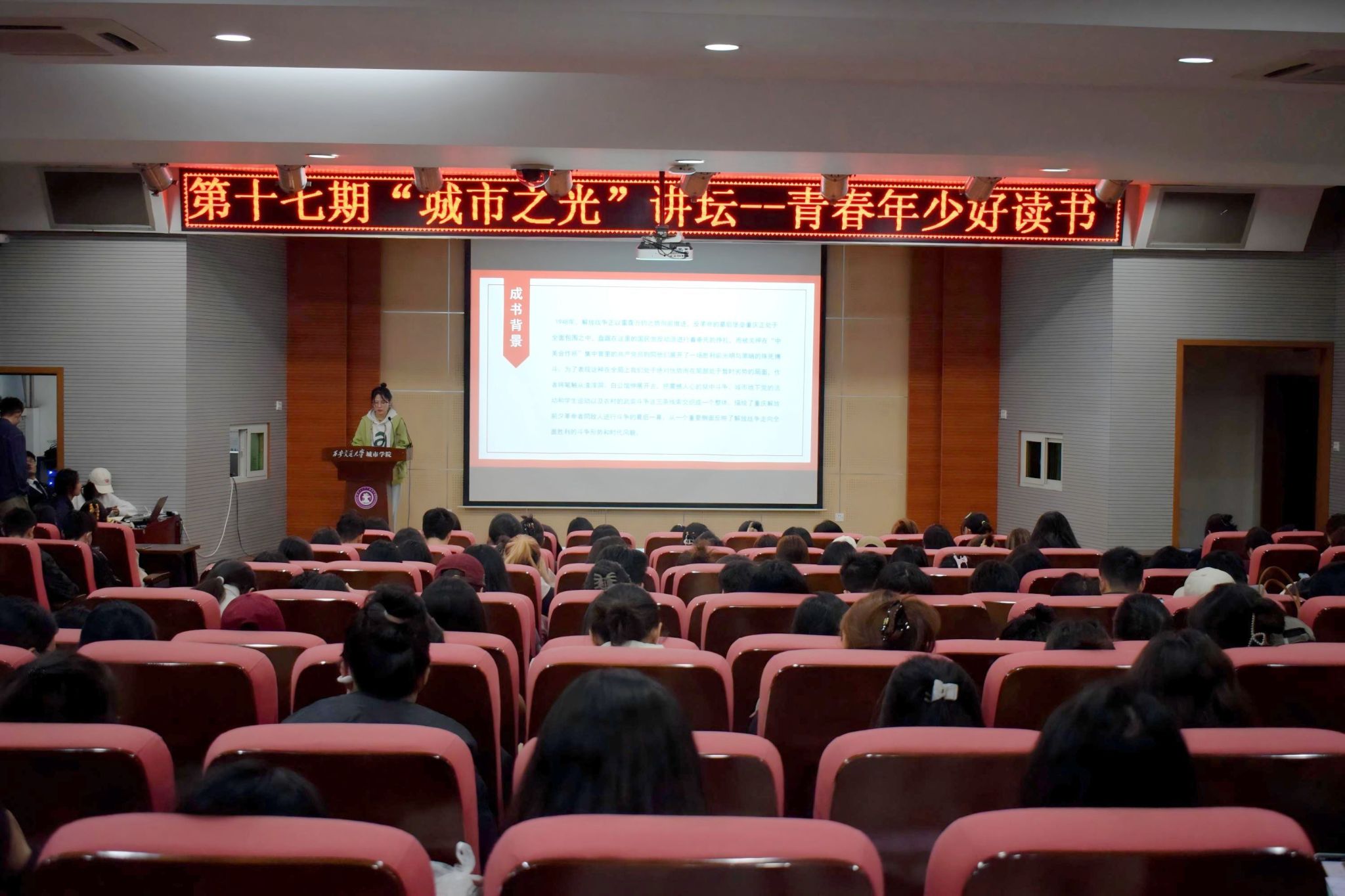 3月27日晚,第十七期“城市之光”讲坛在F100报告厅举行。本次活动以“青春年少好读书”为主题,通过深度解读经典文学作品,引导青年学子在阅读中汲取智慧,为青春成长注入精神力量。郭婵娟、张挺、王阳静作为主讲人,以独到见解和生动讲述,带领现场200多名同学共赴一场思想与文化的盛宴。