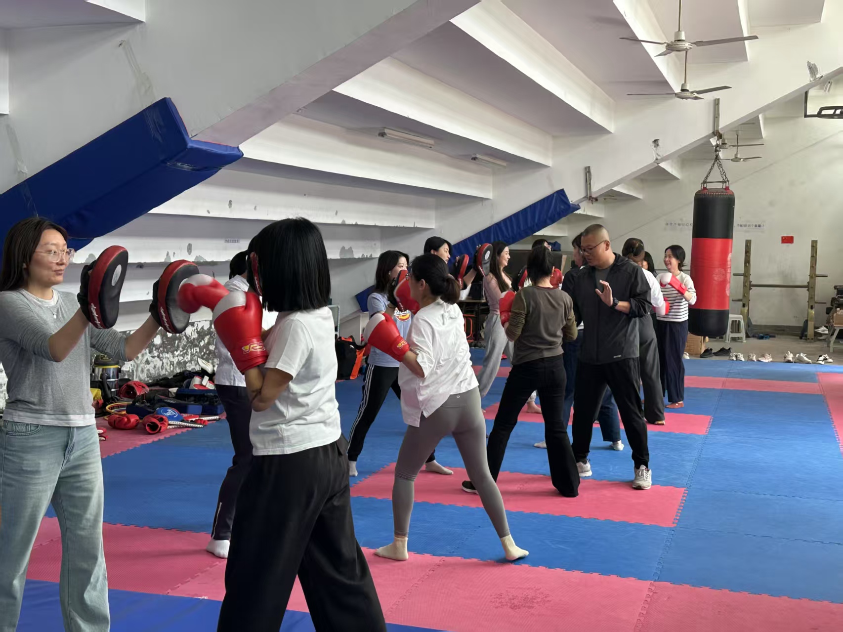 本次课程从基础技能入手,学员们展现出饱满的精神状态。在首节课中,教练指导学员们学习了散打的基本技巧,包括实战站姿、直拳、直拳组合等动作,并融入了趣味性的体能训练与放松拉伸环节。尽管许多教职工是初学者,但他们的学习热情高涨,课堂氛围积极向上,充满了欢声笑语。