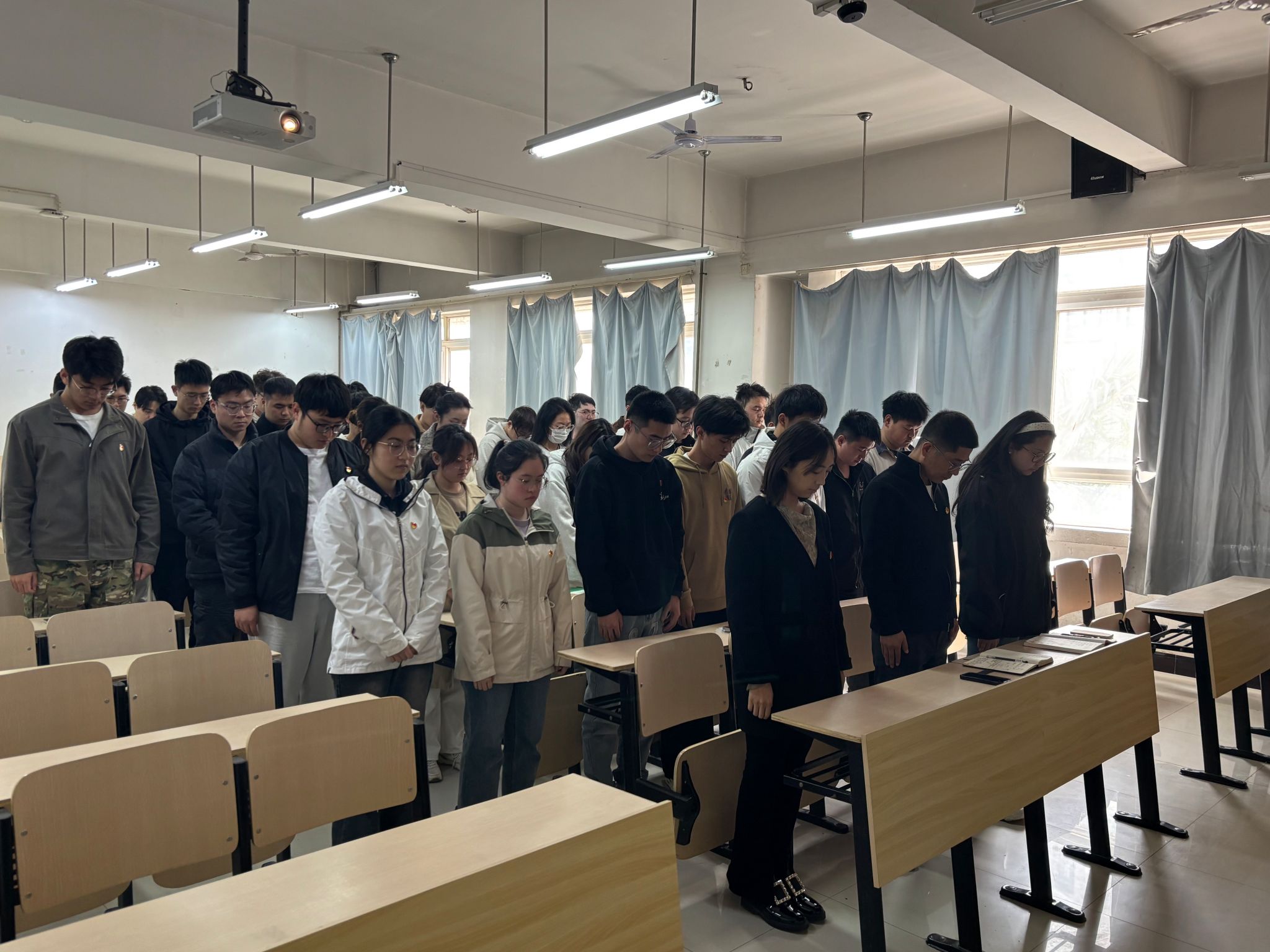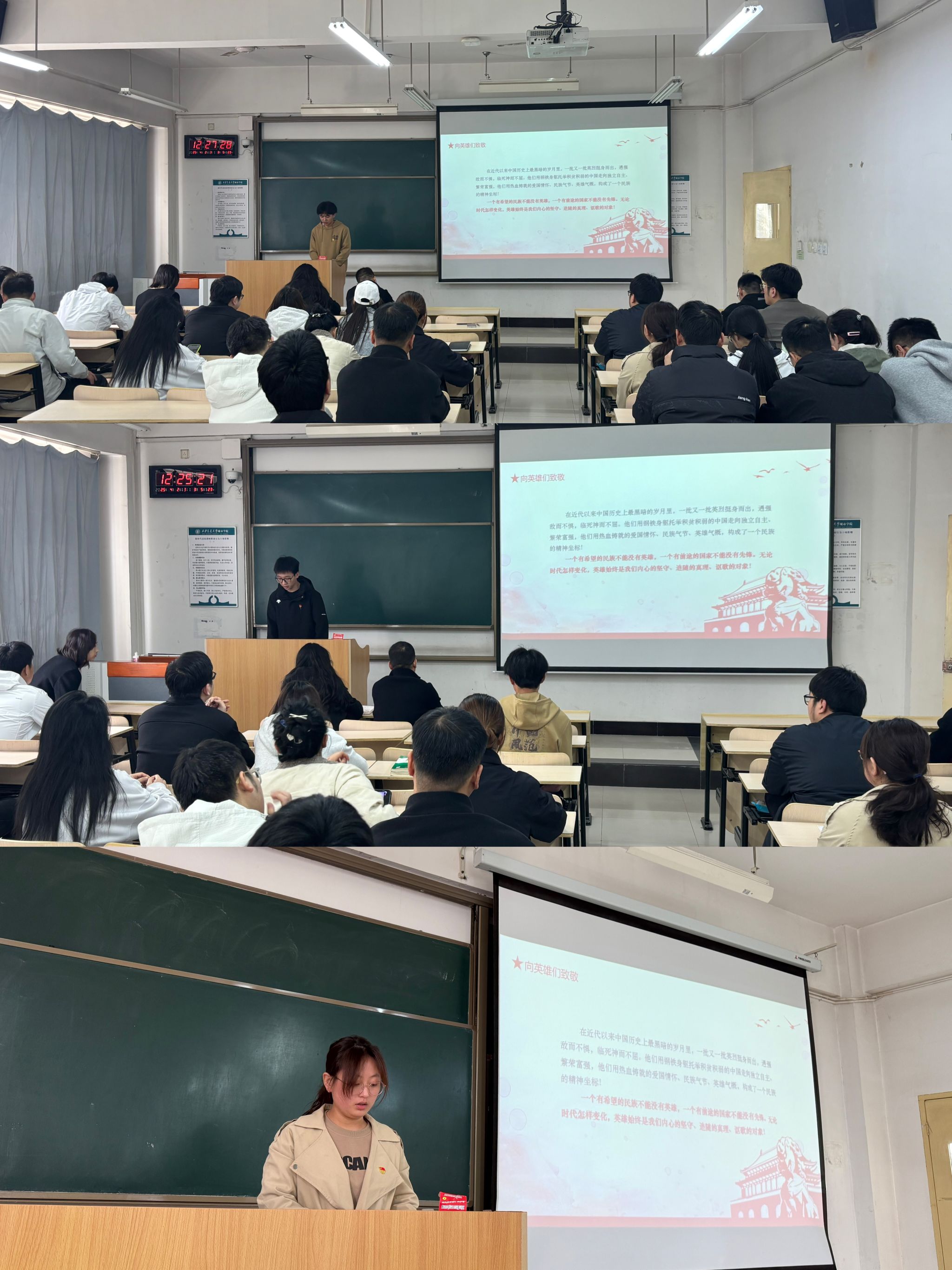 活动伊始,辅导员杨洋向大家介绍了烈士的定义,并组织观看了西安九烈士的纪录片。随后,全体党员在教室中整齐列队,庄严肃立,深切哀悼,表达对革命先烈的崇高敬意。随后,鱼涛、潘嘉译,罗荣荣分别为大家分享了谢子长、陈祥榕、黄继光等先烈的故事,党员们深刻感受到先烈们为了国家独立、民族解放和人民幸福所付出的巨大牺牲。
