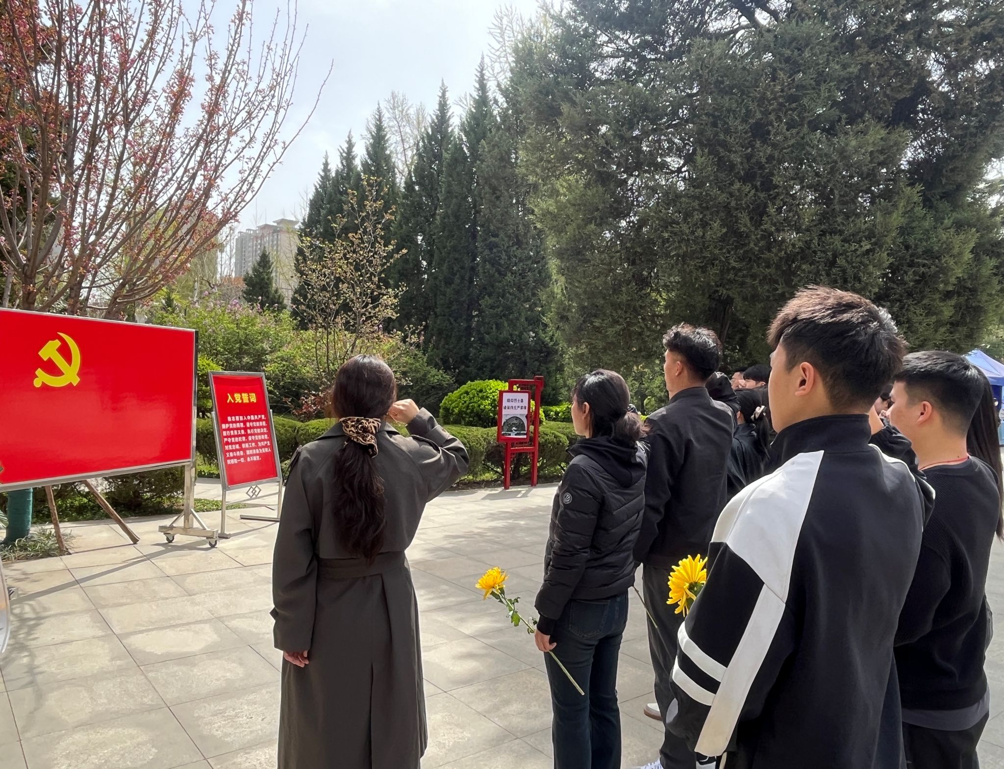 4月2日下午,经济与管理学院学生第三党支部前往西安烈士陵园开展清明祭扫活动。苍松翠柏映忠魂,浩气长存铸丰碑。在庄严肃穆的烈士纪念碑前,全体党员整齐列队,脱帽肃立,向为国家和人民英勇献身的烈士们默哀,大家神情庄重,在静默中寄托对先烈们的无限哀思。随后,全体党员面向党旗,高举右拳,重温入党誓词,一句句铿锵有力的誓言,表达了党员们对党的忠诚和为党的事业奋斗终身的决心。仪式完成之后,支部党员们有序步入墓区,向长眠于此的革命烈士们献上鲜花,表达对先烈们的敬意和缅怀。
