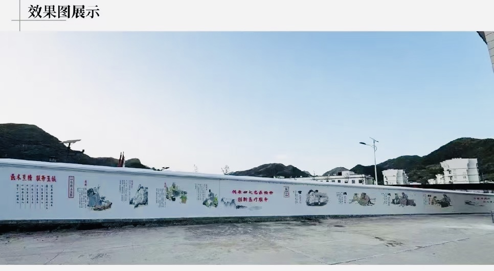 经过多次实地调研与深入交流,艺术学院组建专项团队,以"传承医道精粹,彰显地域特色"为创作主旨,精心构建了融合传统医学文化与秦岭风物的设计体系。设计方案既包含"中华四大名医"的人物群像、"中医诊断四法"的意境图谱,又将"秦药中草药"等地方元素融入其中,在方寸白墙间构筑起一座流动的中医药文化长廊。