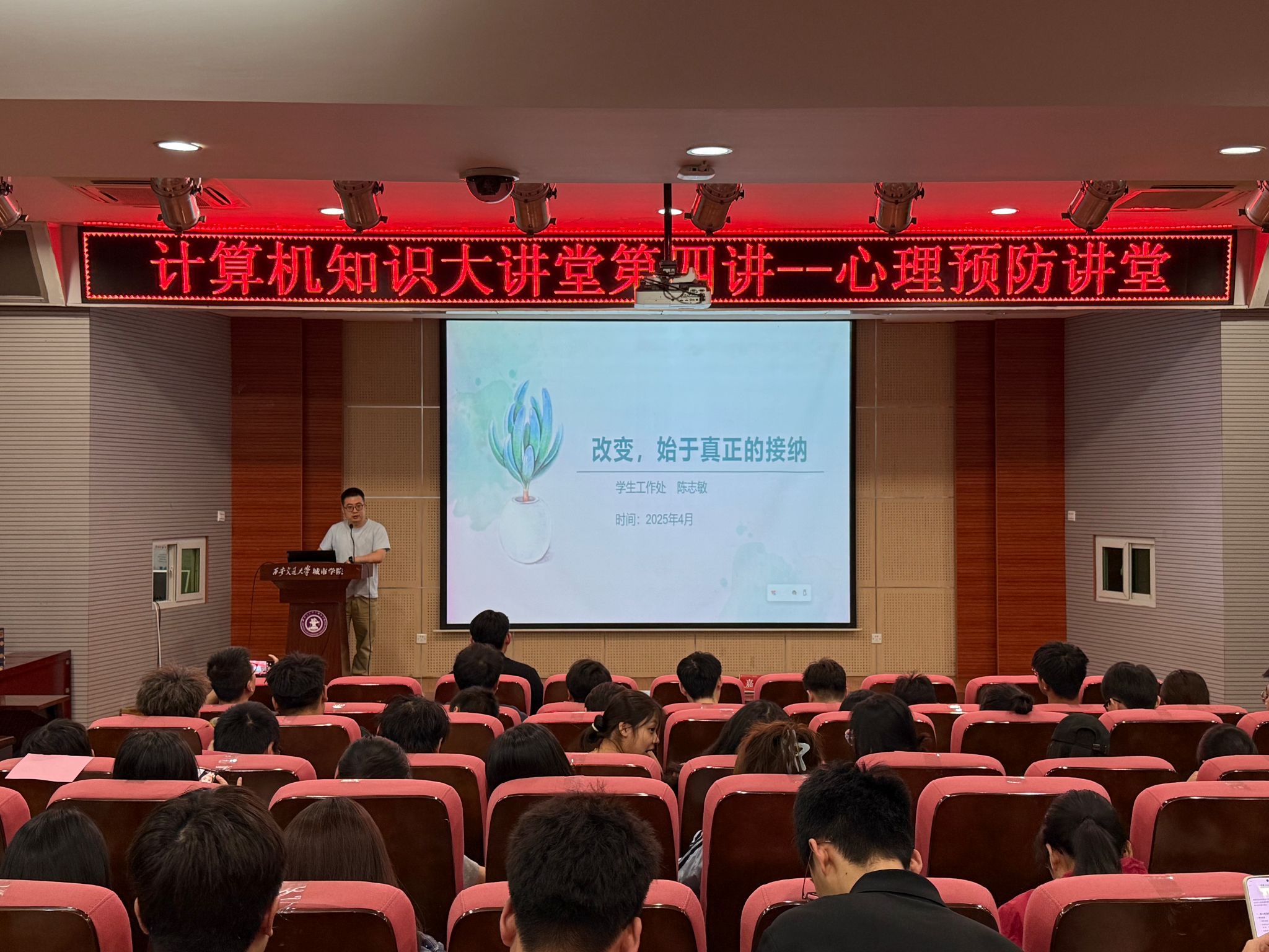 4月23日下午,计算机学院计算机知识大讲堂第四讲在F100报告厅举行。本次讲堂以“改变,始于真正的接纳”为主题,聚焦大学生心理健康与自我成长,从“可以不变好,才能变好”“探索自己想要改变的真正内在动机”“给自己设置‘最理想的挑战’”三个维度展开,帮助学生在接纳中实现蜕变。计算机学院特邀到yl7703永利官网学生工作处心理健康教育教师,国家二级心理咨询师陈志敏为同学们带来精彩分享。
