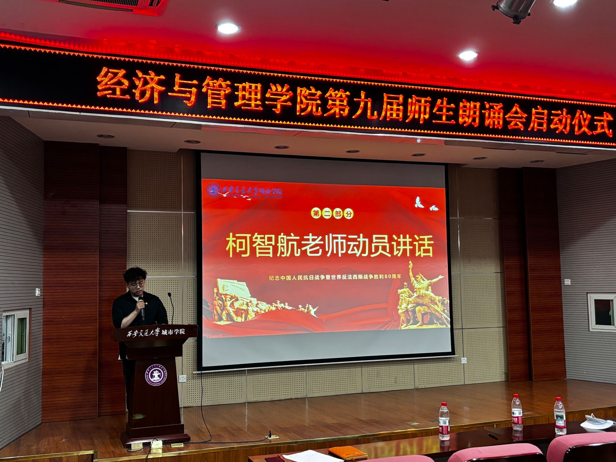5月11日晚,经济与管理学院在F100报告厅举办了“纪念中国人民抗日战争暨世界反法西斯战争胜利80周年”师生朗诵会启动仪式。学生第一党支部书记刘健、组织委员康轲岚,学生第二党支部书记宣传委员史青,团工委书记柯智航参加活动。