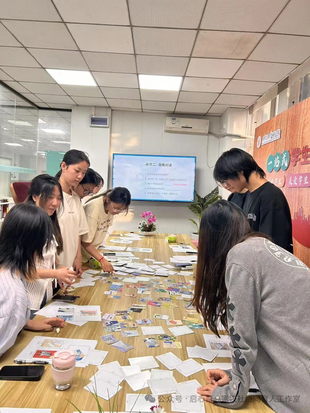 5月15日,在心育专员张德馨的指导下,在五号楼一站式学生社区开展了“减压赋能,悦心前行”OH卡心理沙龙。活动开场,同学们随机抽取卡牌并讲述卡牌引发的联想与故事,此过程将潜意识的想法和情感具象化,从而帮助大家更好地认识自我、释放情绪。在自由探索环节,同学们怀着好奇与期待,纷纷抽取OH 卡进行解读。有人抽到描绘家庭场景的卡牌,分享了自己对亲情的感悟与困惑;有人抽到充满奇幻色彩的图案,讲述了内心深处不为人知的梦想与憧憬。大家的分享或细腻感人,或充满哲思,现场氛围逐渐从陌生拘谨变得真诚热烈。