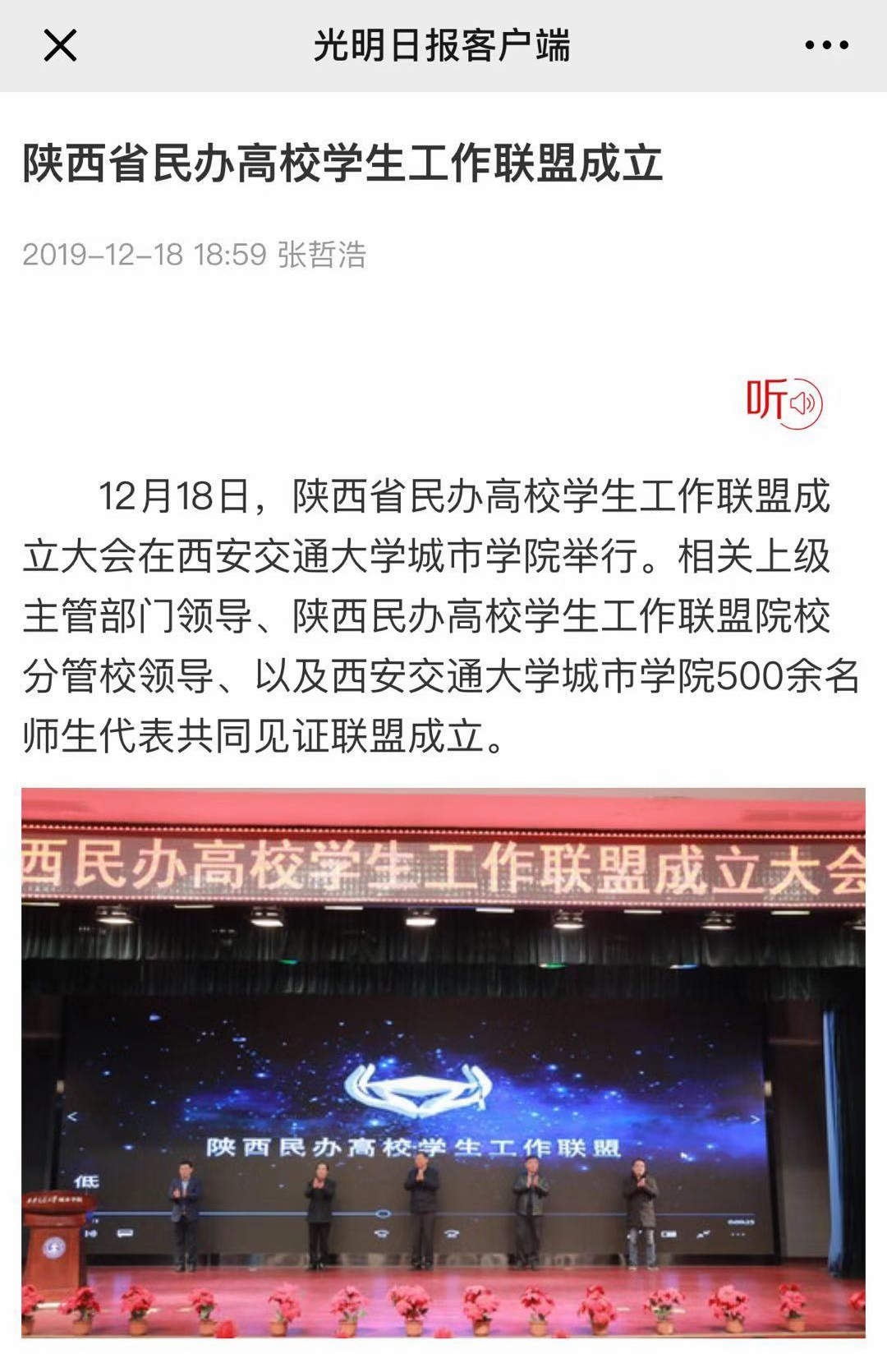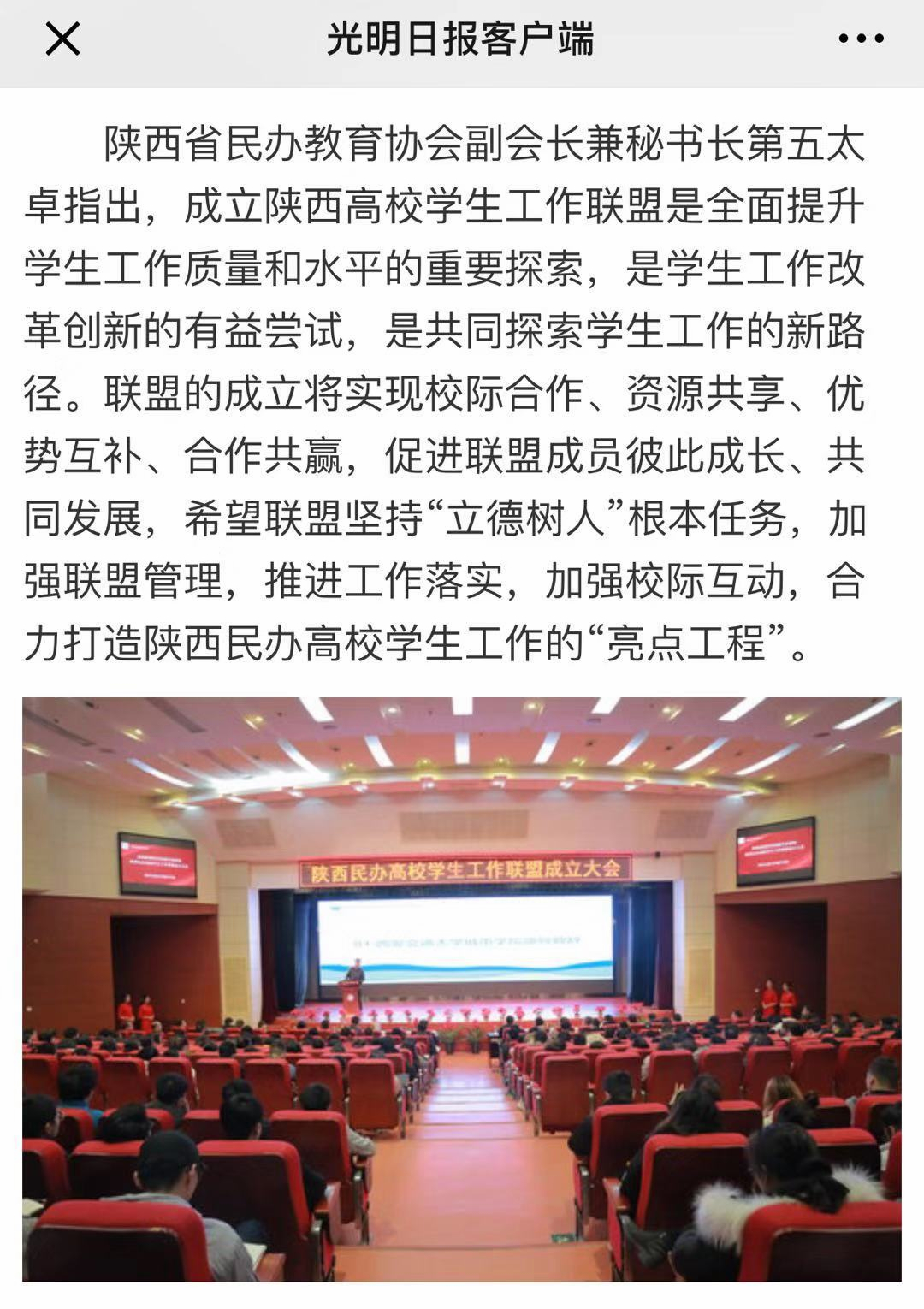 近日,光明日报客户端报道了陕西省民办高校学生工作联盟成立大会盛况。据悉,此次大会在yl7703永利官网举办。