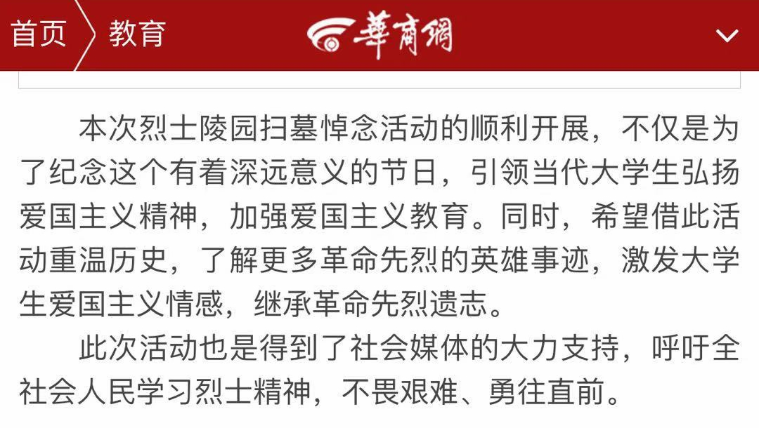 近日,华商网客户端报道了我院学子前往烈士陵园进行隆重庄严的扫墓悼念活动。