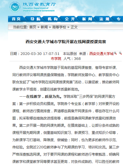 近日,陕西省教育厅对我院开展在线网课授课竞赛进行了报道。