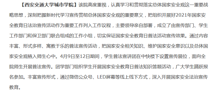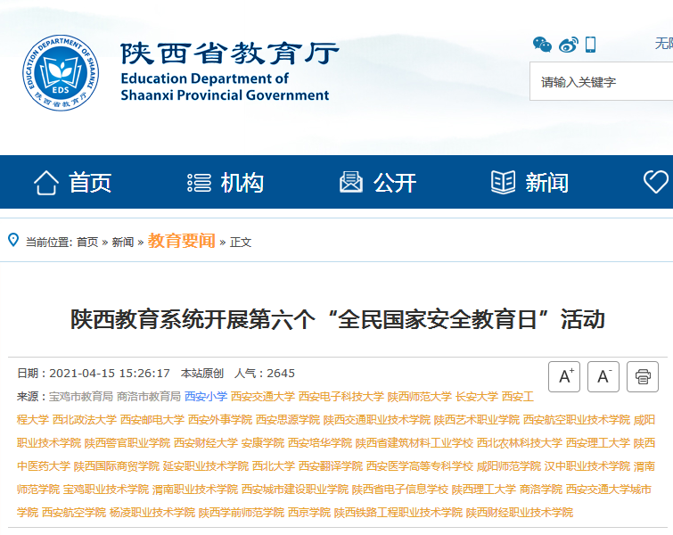 近日,陕西省教育厅报道了学院开展“全民国家安全教育日”情况。报道链接和内容如下: