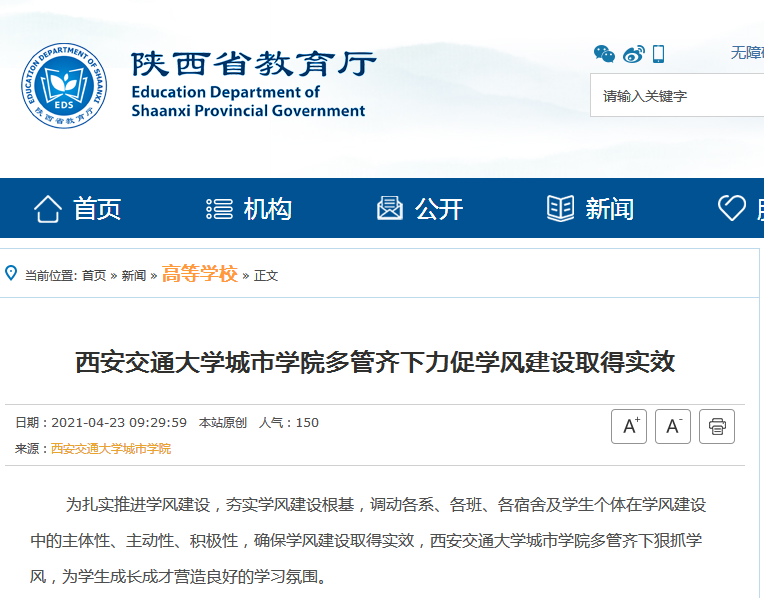 近日,陕西省教育厅官网报道了学院学风建设情况。具体内容与链接如下: