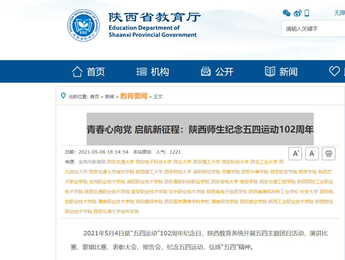 链接:青春心向党 启航新征程:陕西师生纪念五四运动102周年_教育要闻_新闻_陕西省教育厅 (shaanxi.gov.cn)