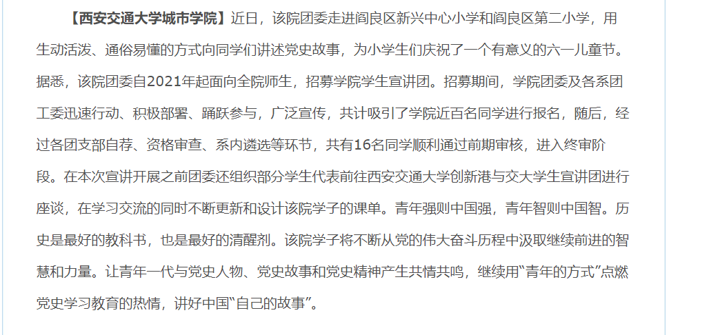 近日,陕西省教育厅官网报道了学院“大手拉小手”党史宣讲团走进小学生活动情况。具体链接如下