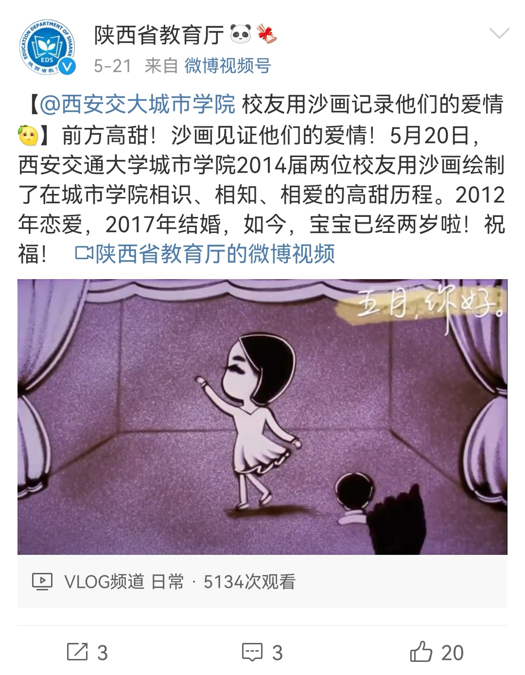 5月21日,陕西省教育厅微博报道了学院校友用沙画记录爱情。