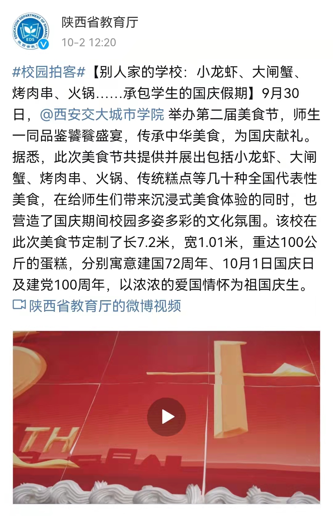 【陕西省教育厅官方微博】别人家的学校:小龙虾、大闸蟹、烤肉串、火锅……承包学生的国庆假期