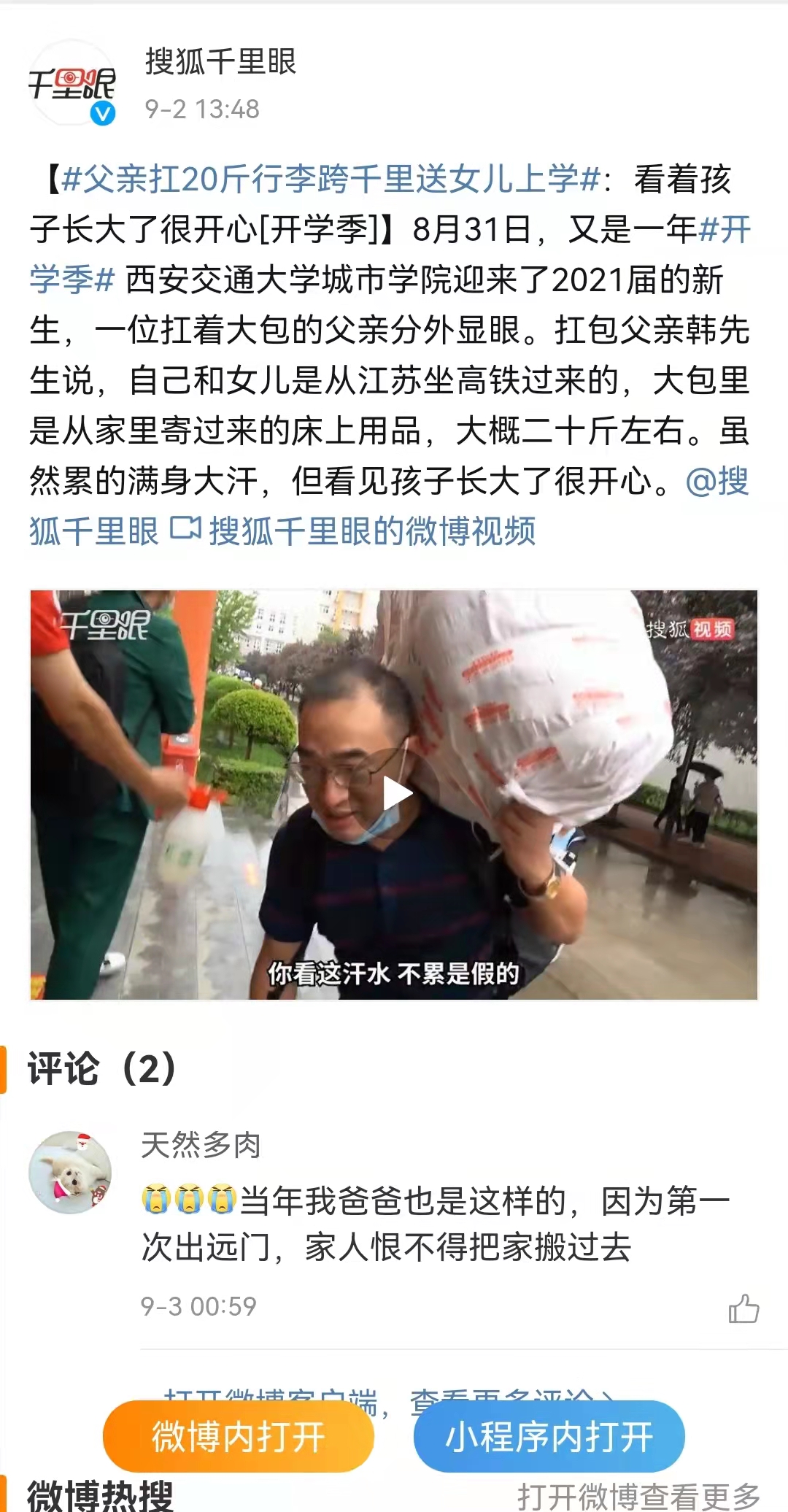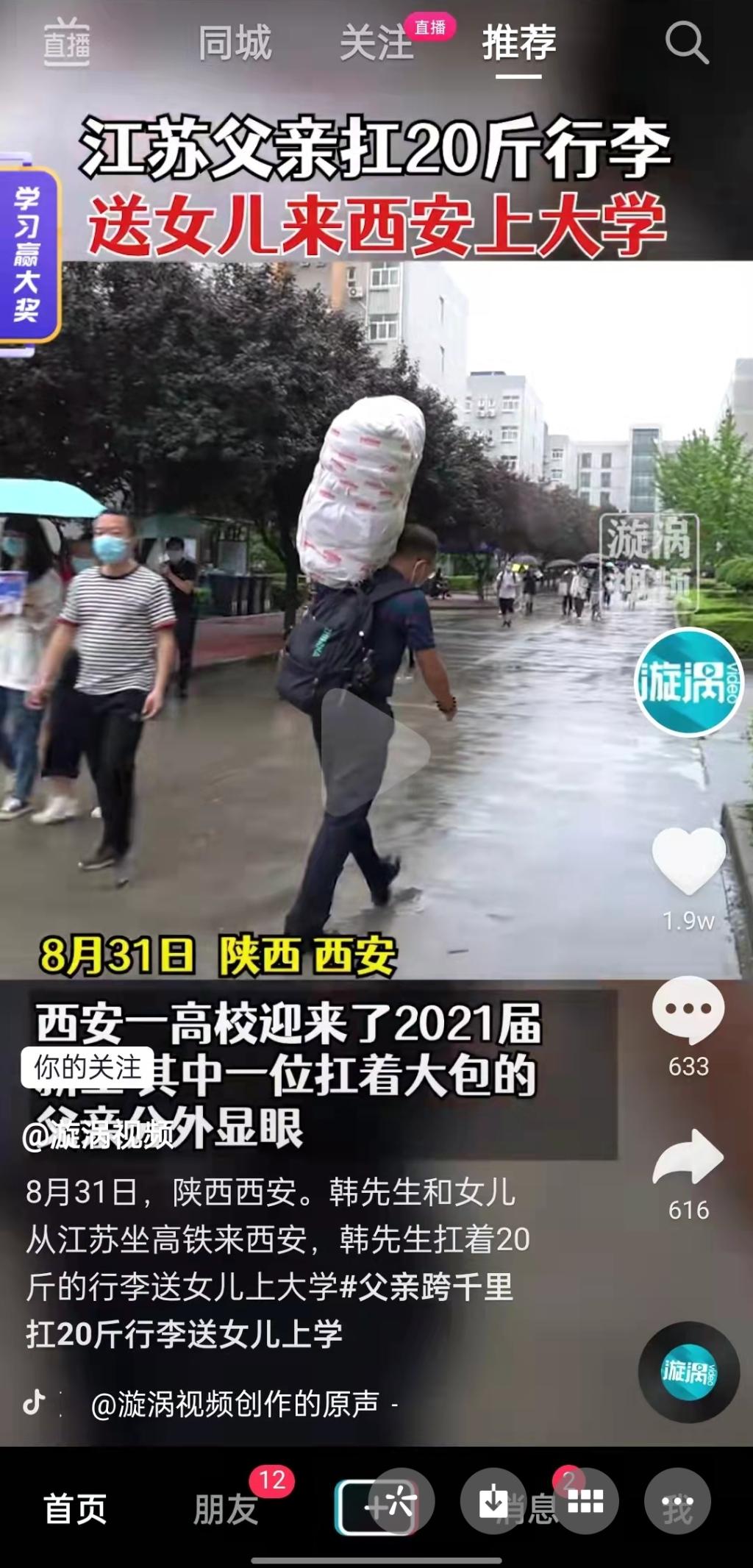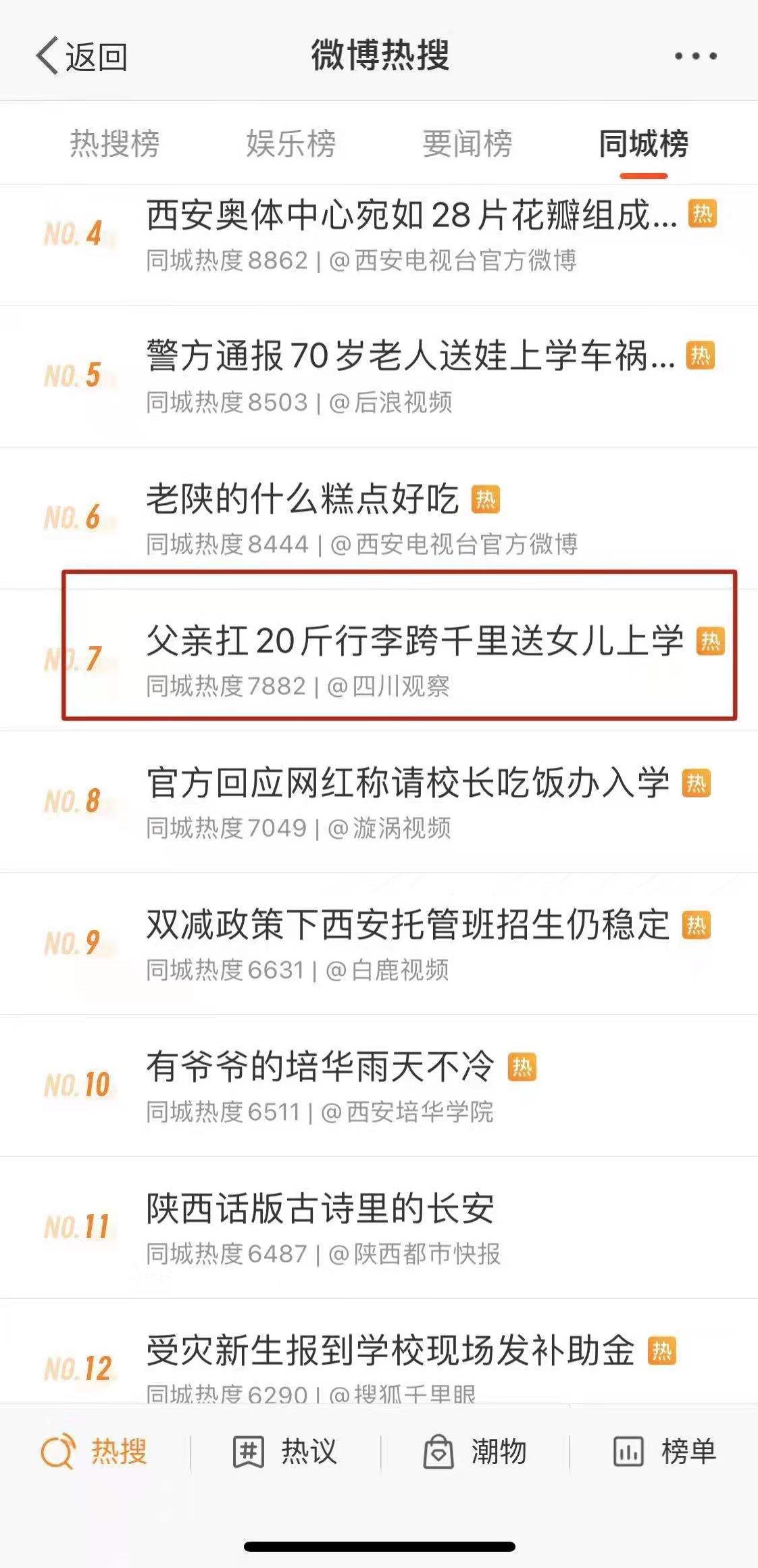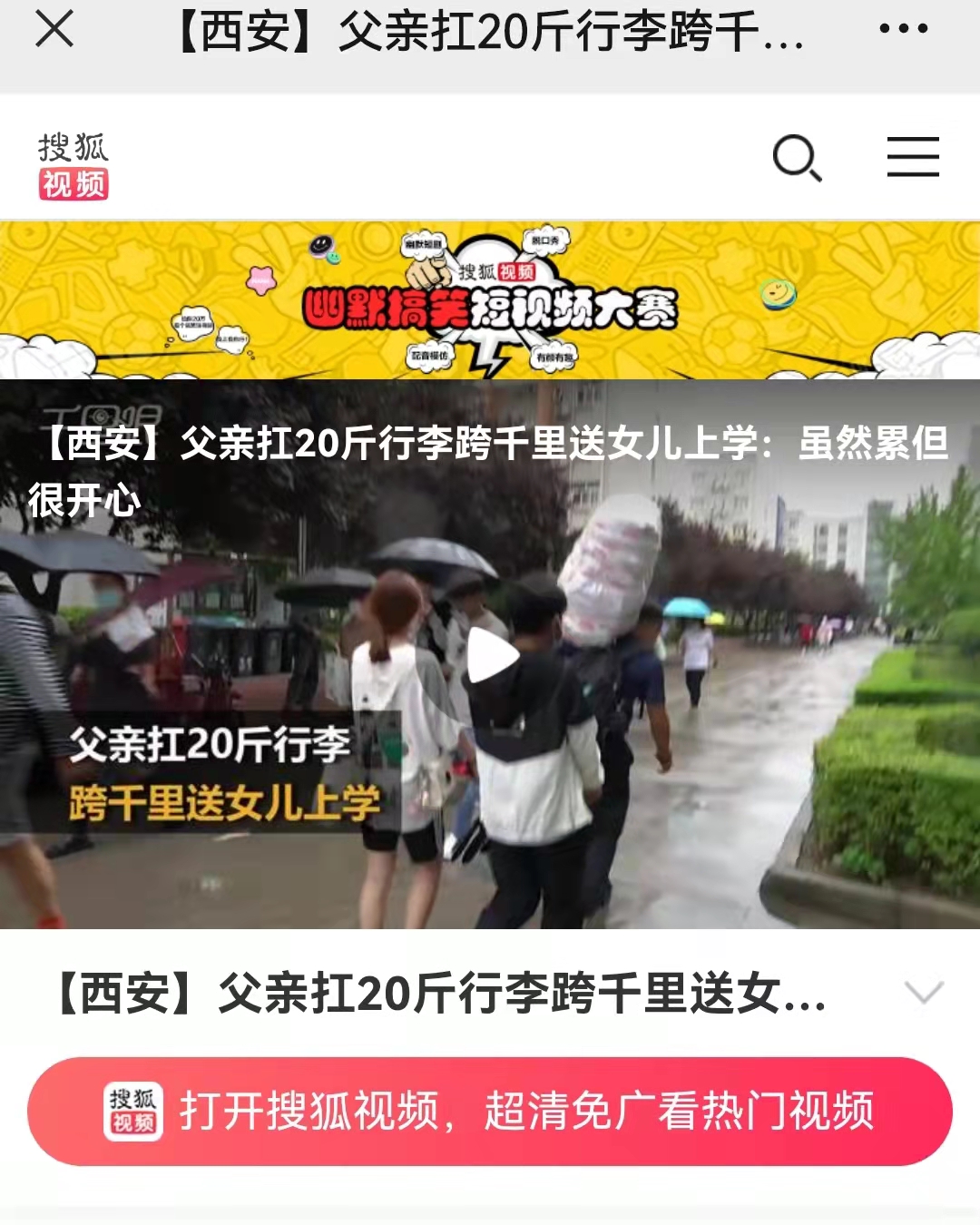 9月2日,搜狐视频、搜狐千里眼、漩涡视频抖音号报道了学院新生报到情况。内容为我院新生家长送女上学视频,网络累计阅读量超10万,登上同城热搜第七位。