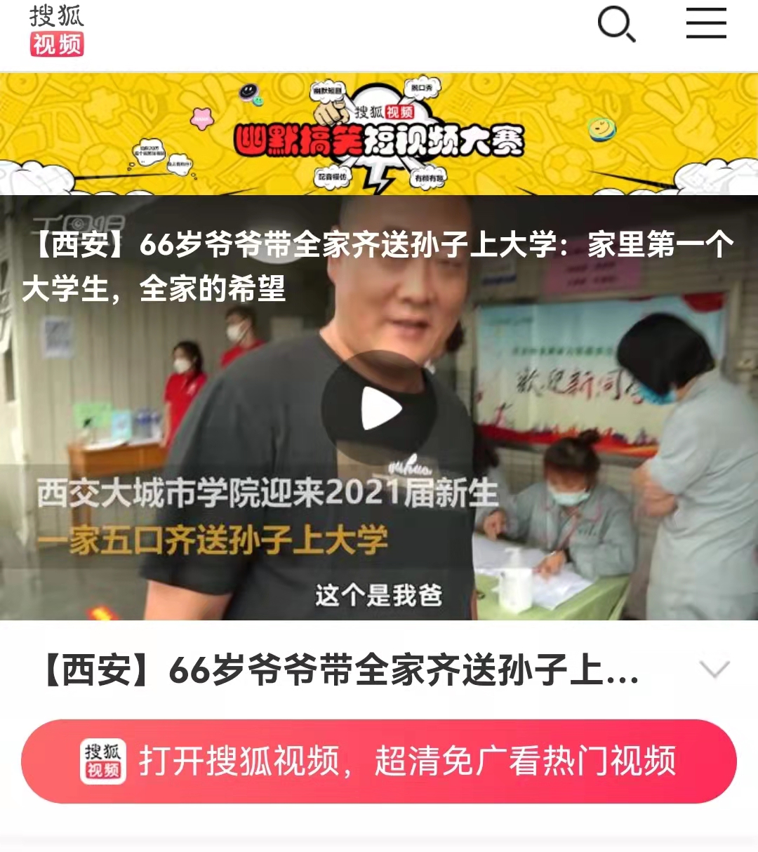 9月2日,搜狐千里眼报道了学院迎新生中一幕。66岁爷爷带全家齐送孙子上大学。爷爷称:家里第一个大学生,全家的希望。