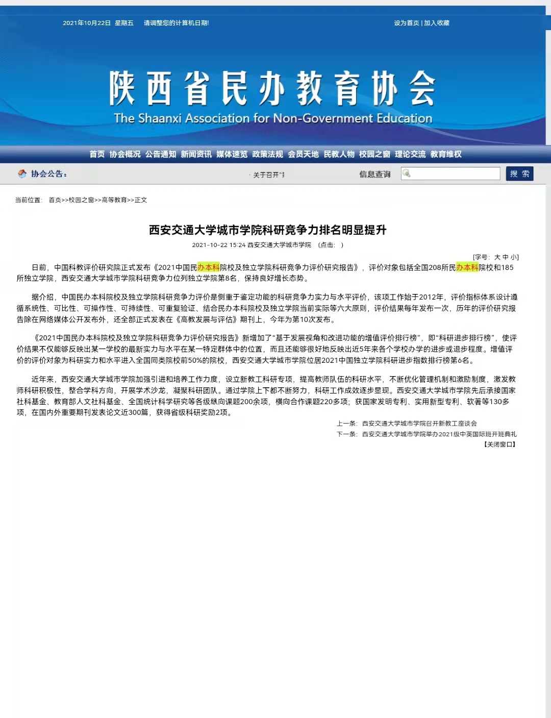 近日,陕西省民办教育协会报道了学院科研竞争力排名提升情况。具体链接及内容如下: