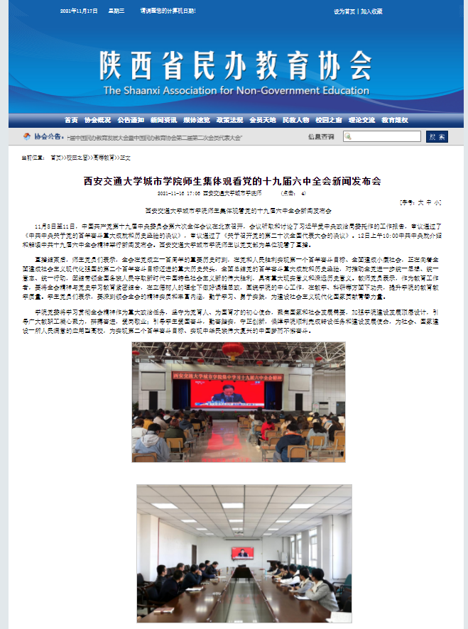 近日,陕西省民办教育协会报道了学院师生观看党的十九届六中全会新闻发布会情况。具体链接及内容如下: